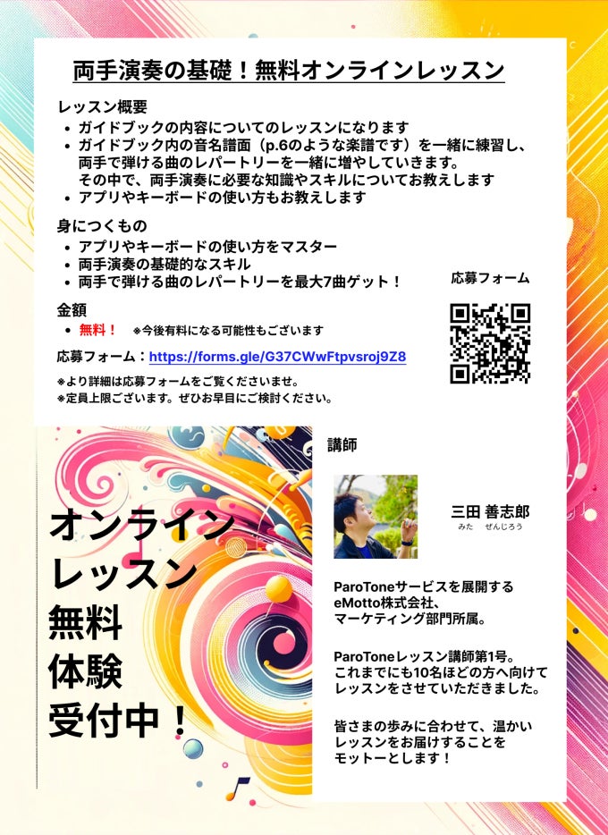 ParoToneの使い方に困っている方、両手演奏に苦戦している方へガイドブックの内容に関するレッスンへのお誘いです。添付の画像も合わせてご確認ください♪