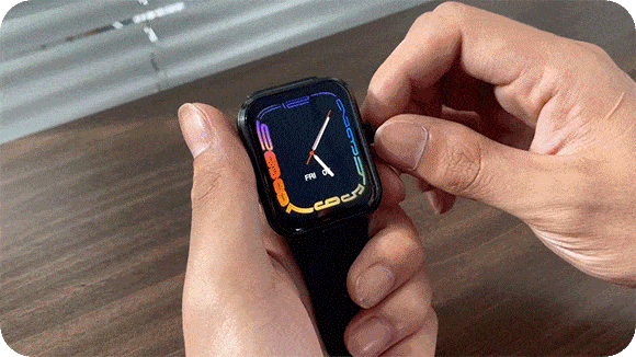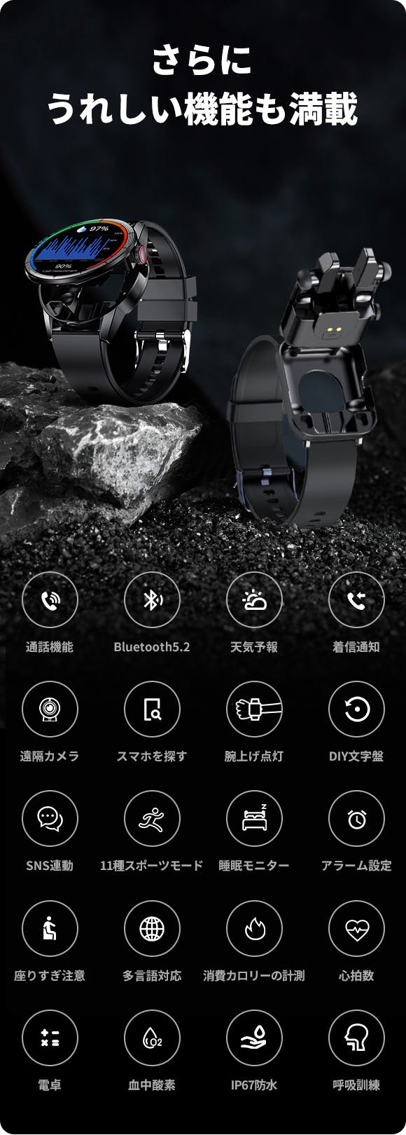 従来のイヤホン内蔵スマートウォッチの難点を解決して、側面のロータリーボタンによって自由に文字盤を切り替えることを実現しました。
