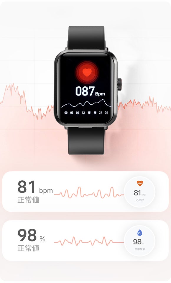 心拍数、血中酸素濃度などのデータを数値化します。24時間リアルタイムで測定・記録できます。