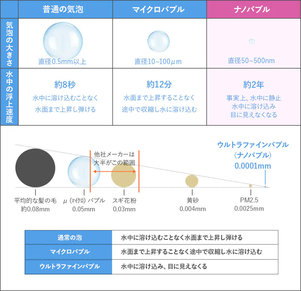 「シャンパーニュ・カーボン」に閉じ込められた炭酸はマイクロバブルよりもはるかに小さなナノバブル化に成功しました。小さくすると浮力が損なわれ、なんと約2年も溶け込み続けることができます。これほどの小さなナノバブルにすることができました。