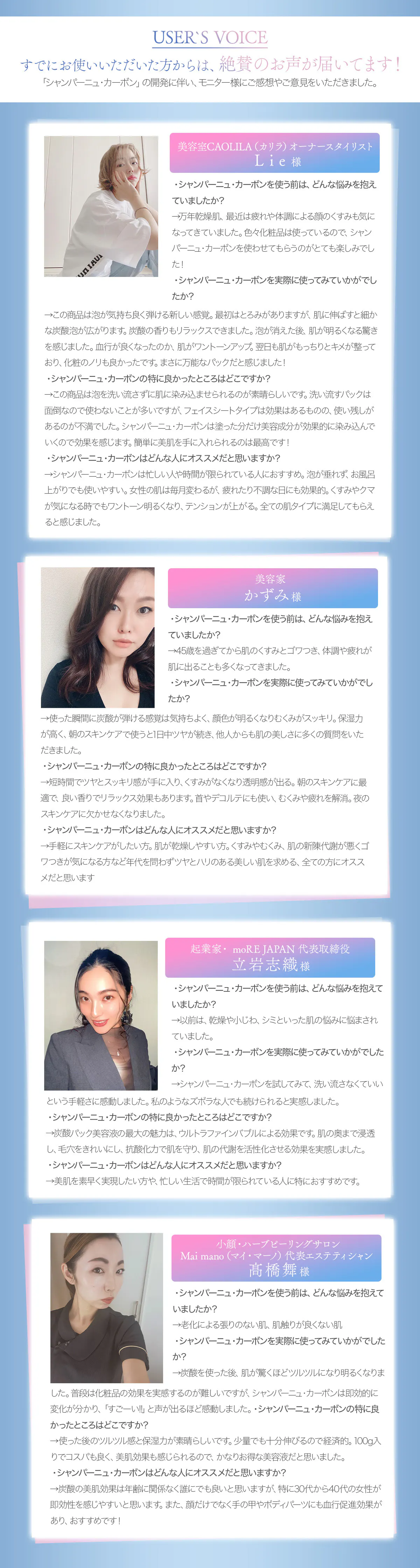 これらを炭酸パックを「洗い流さない」という手軽さでありながら、1本で担う「真のオールインワンの炭酸ガス美容クリームパック」という新しいカテゴリーを私たちで創っていきます。