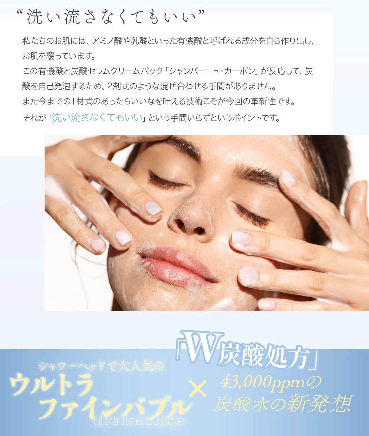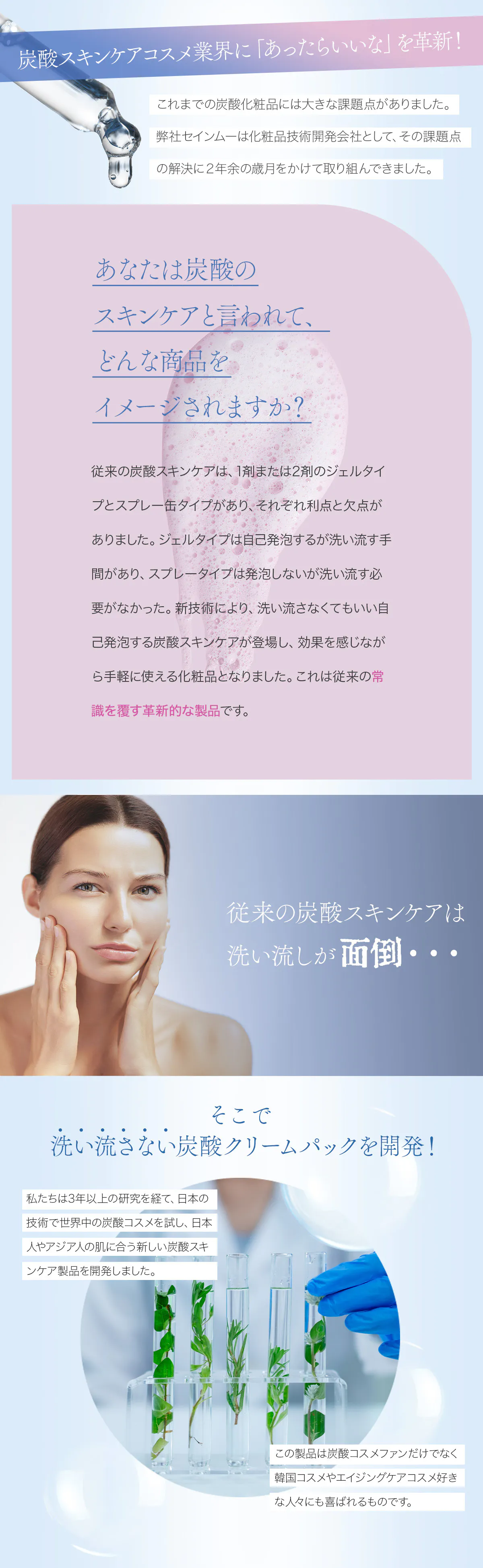 1剤式で、満足のいく炭酸効果が期待できて、さらに肌ダメージが少なく、安全に毎日使える。そして最大ニーズである「洗い流さない」というニーズを満たすこと。