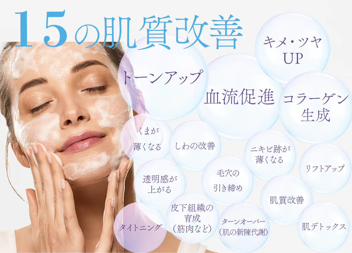 炭酸スキンケアとして新陳代謝・血行を促進しながら、お肌のトーンアップやキメツヤアップ、クマやシワの改善、ニキビ跡補修、毛穴引き締め、肌質改善・・・。さらに潤ったお肌の水分が逃げて行かないように、そっと蓋をする。