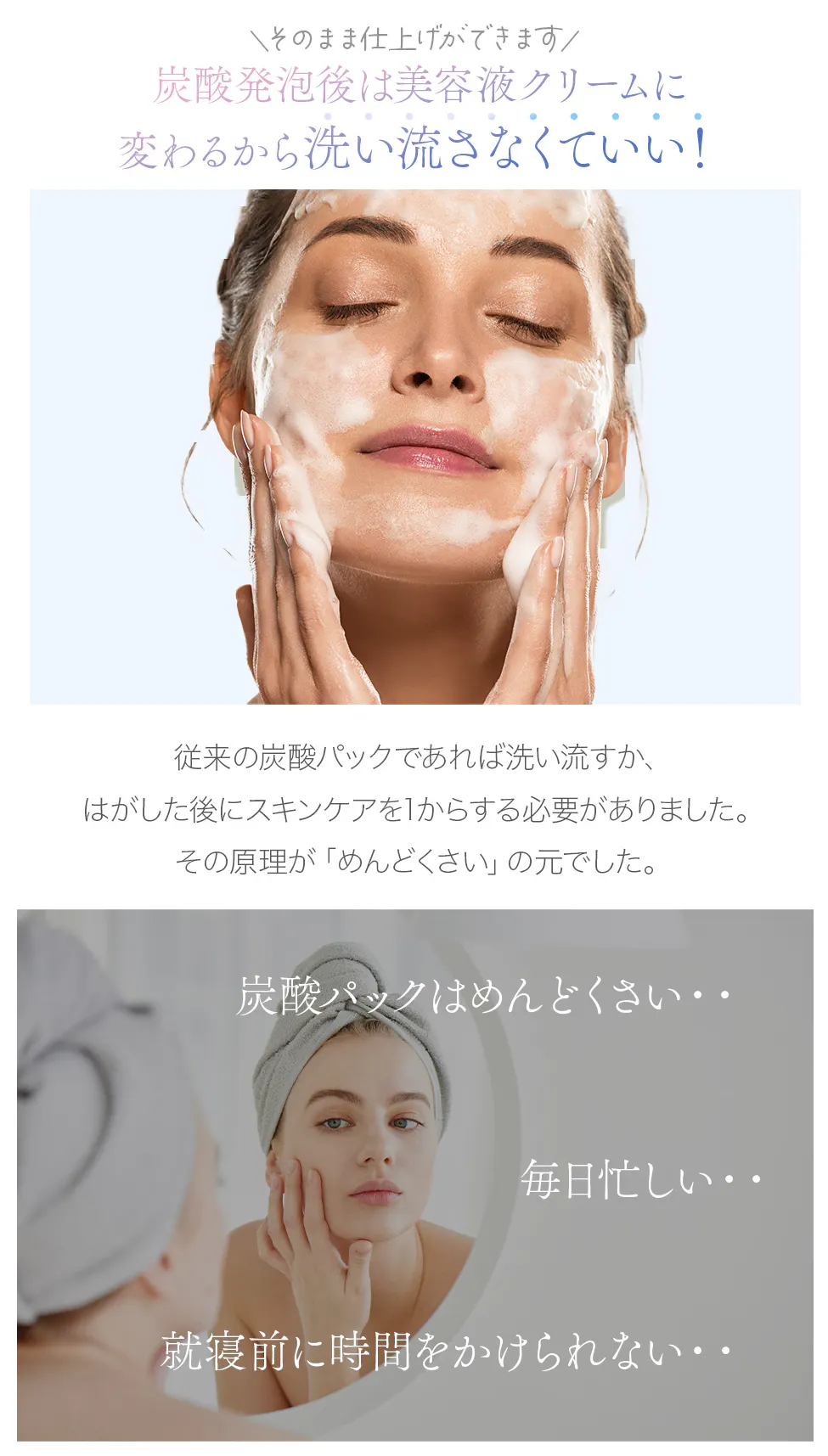 炭酸ガスコスメは愛されるクオリティであっても、めんどくさいから続けられることが難しかったのです。就寝前のスキンケアにじっくり時間をかけられない現代の忙しい人たちに寄り添う商品にするためには、炭酸パックだけではなく、その後のスキンケアの役目まで担ってくれて、手軽に最高のお肌を作ってくれる商品にしたかったのです。