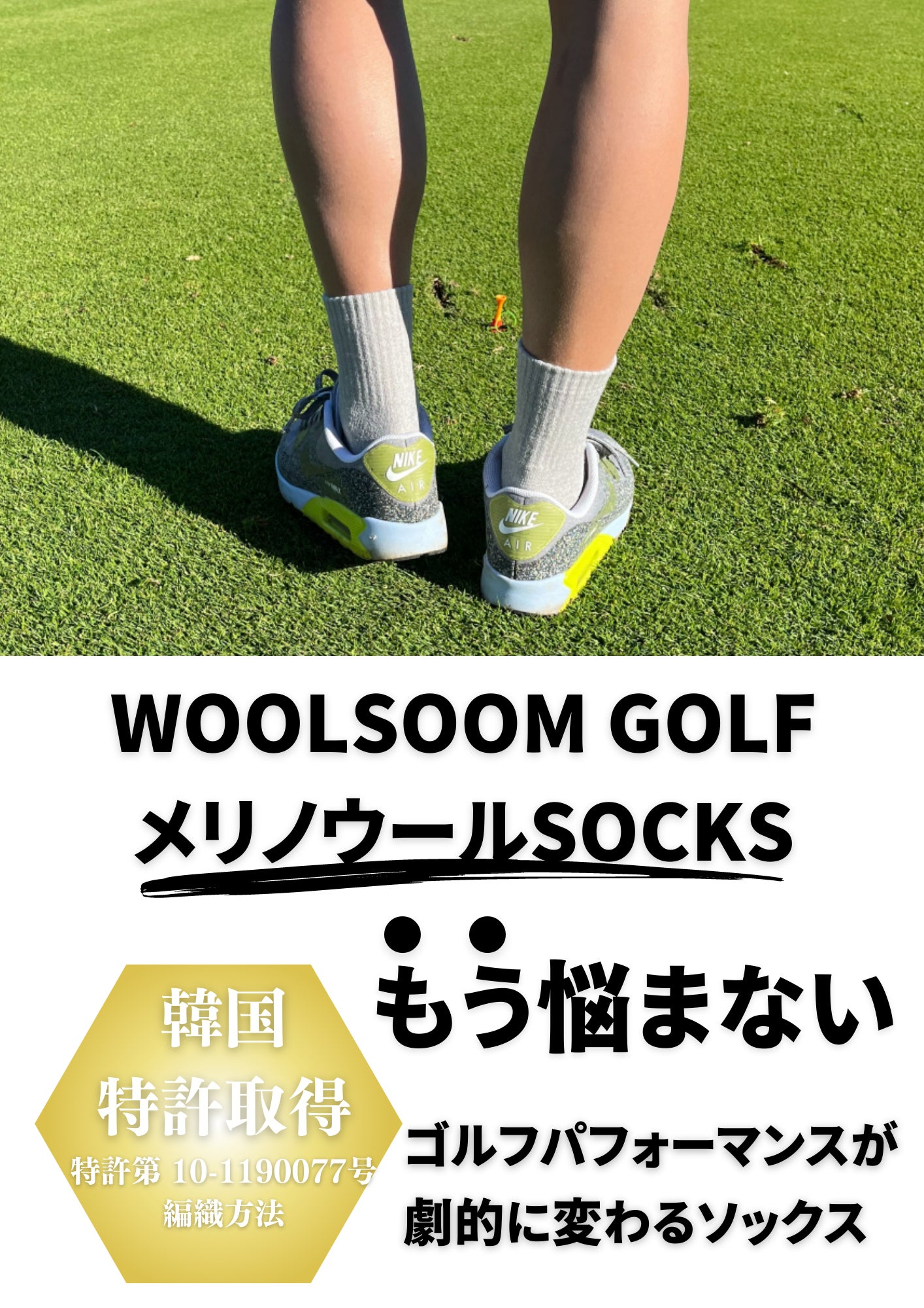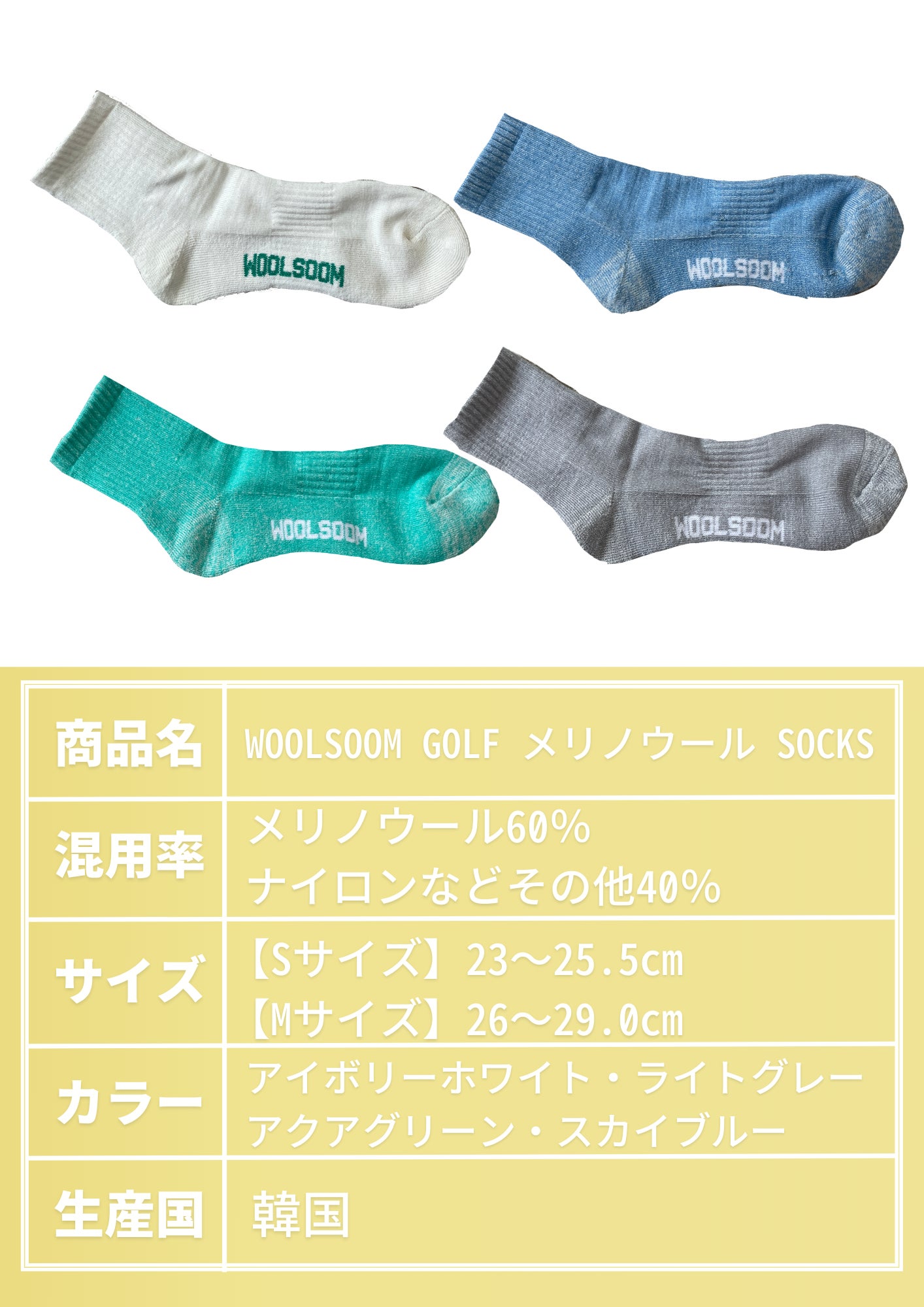 【WOOLSOOM GOLF メリノウールSOCKS】は吸湿性・通気性に優れ、韓国特許技術を使った編み方で伸縮性と耐久性が強く、100%天然繊維で環境に優しいソックス(靴下)です。