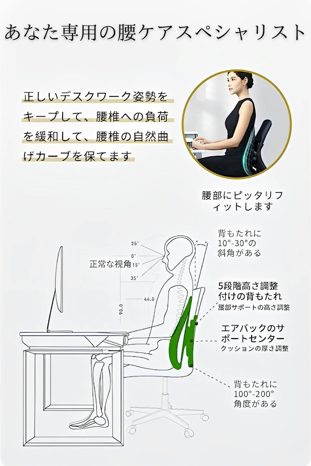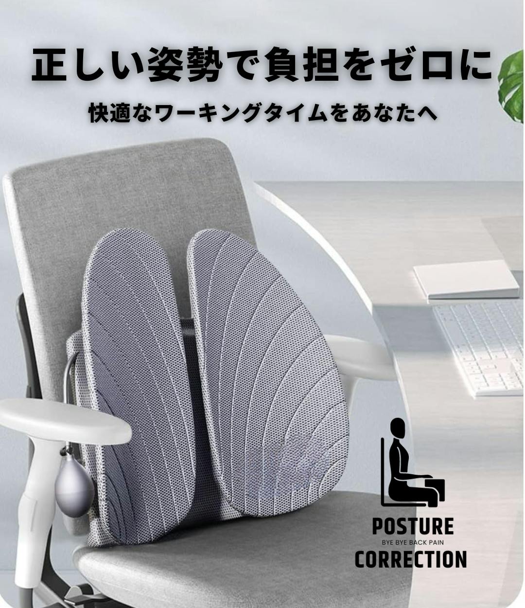 ランバーサポートを付けるだけで、ついつい猫背になってしまうところを正しい姿勢にサポート!