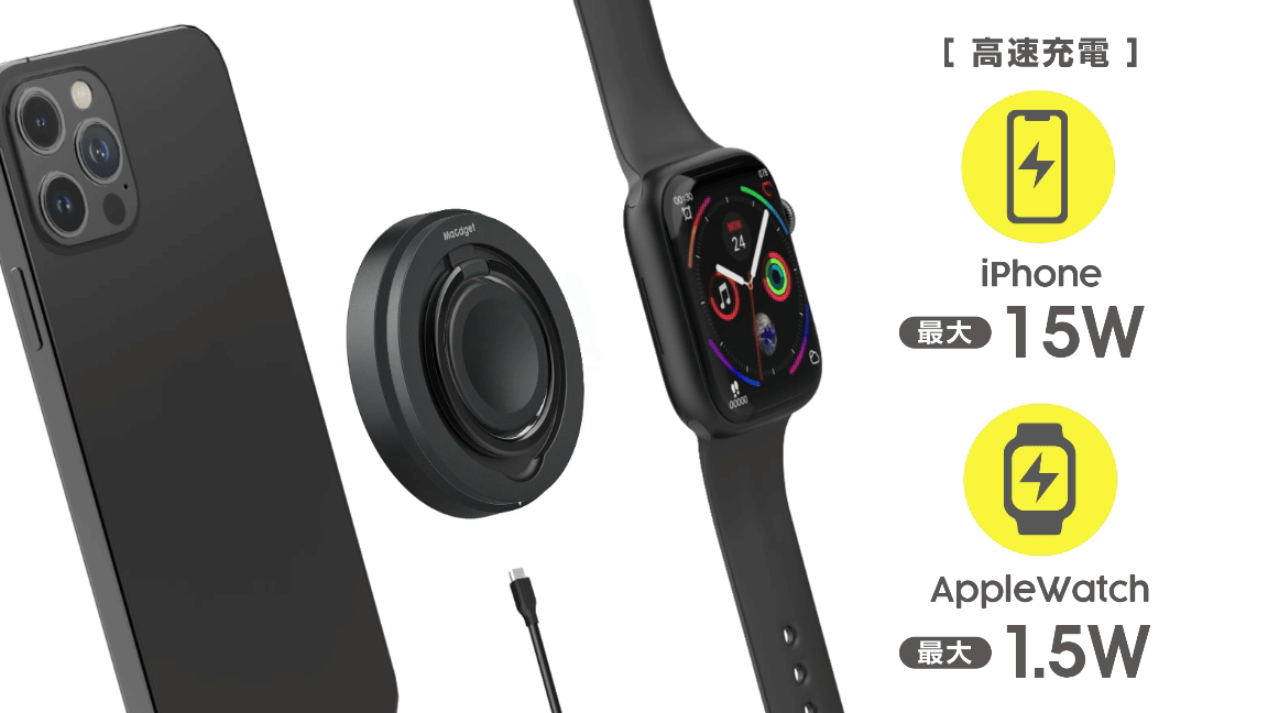 AppleWatchはその反対面の出っ張りに吸着させることで同時に充電が可能です。