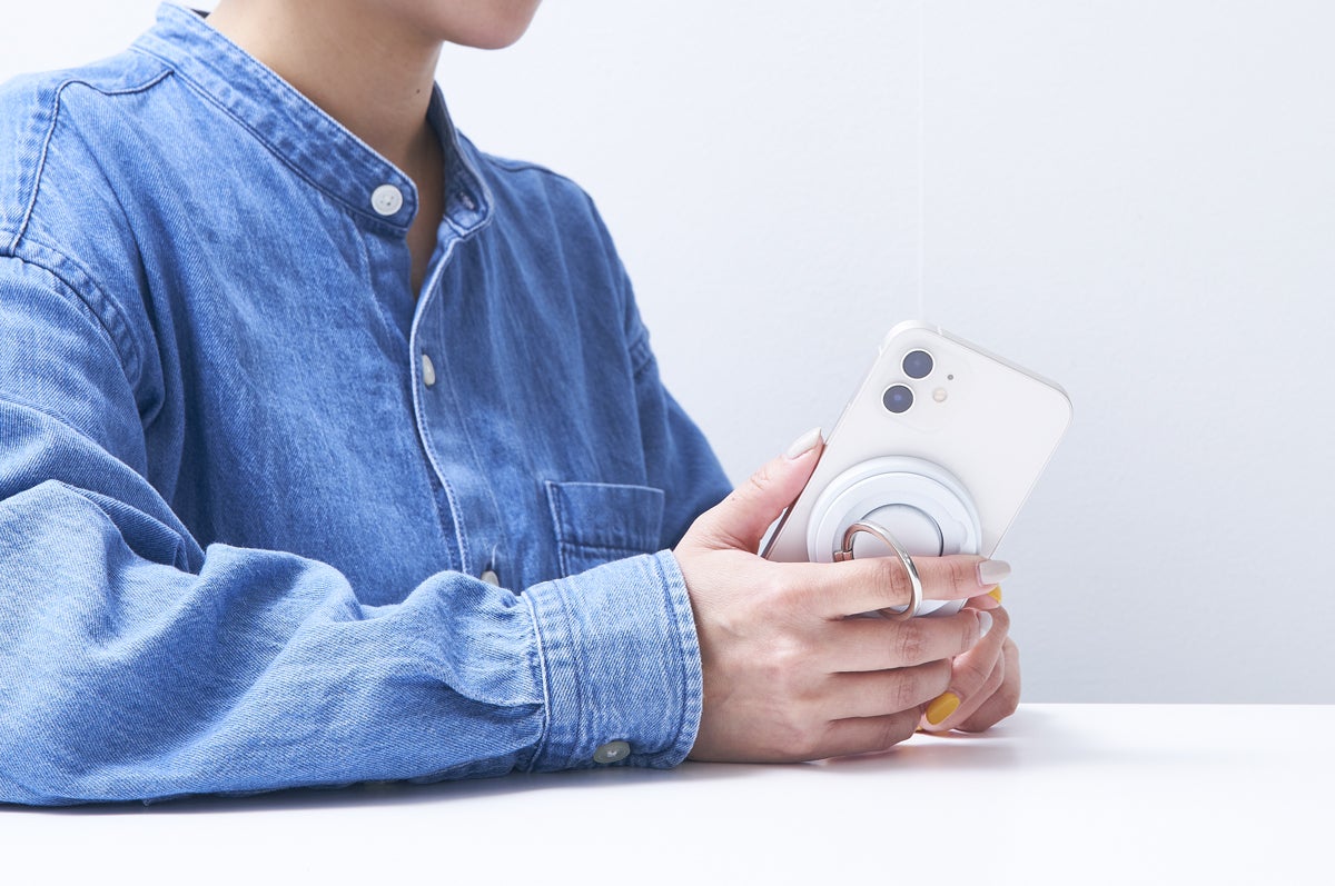 いままでのホールドリングはiPhoneに直接貼付しなければならないため、MagSafe充電を使用できませんでした。MagSafeに対応したホールドリングも流通してはいますが、MagSafe充電をしながら、ホールドリングを使用できる製品はほとんど存在していません。本製品はMagSafe充電をしながら、ホールドリングとしての機能をご使用いただけます。