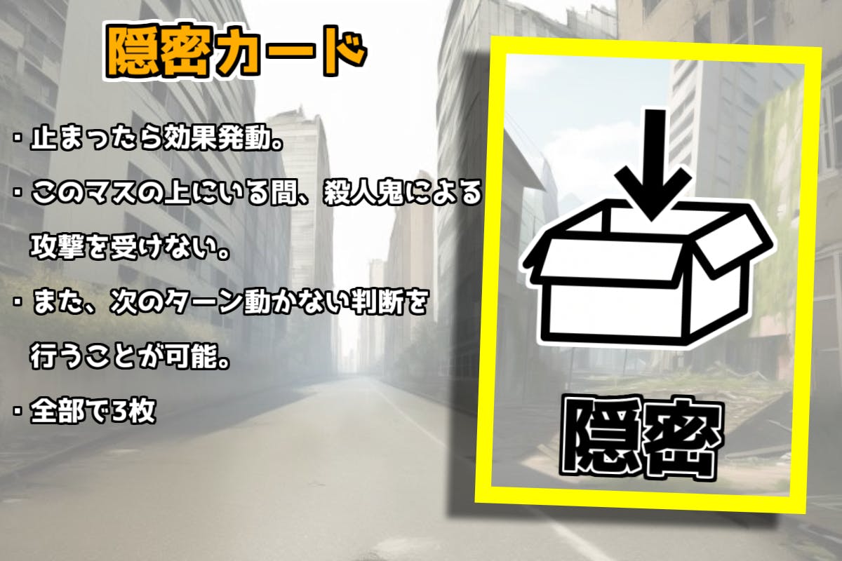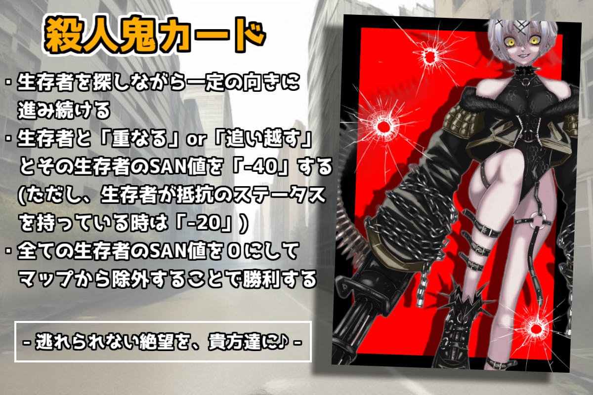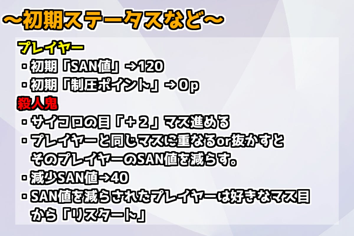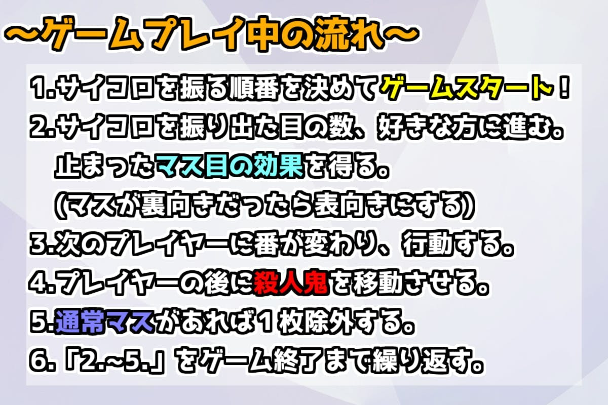 また、このゲームに「スタート」や「ゴール」は存在しません!殺人鬼の位置やマス目の効果を見て、進む方向を好きに決めることが出来ます!!