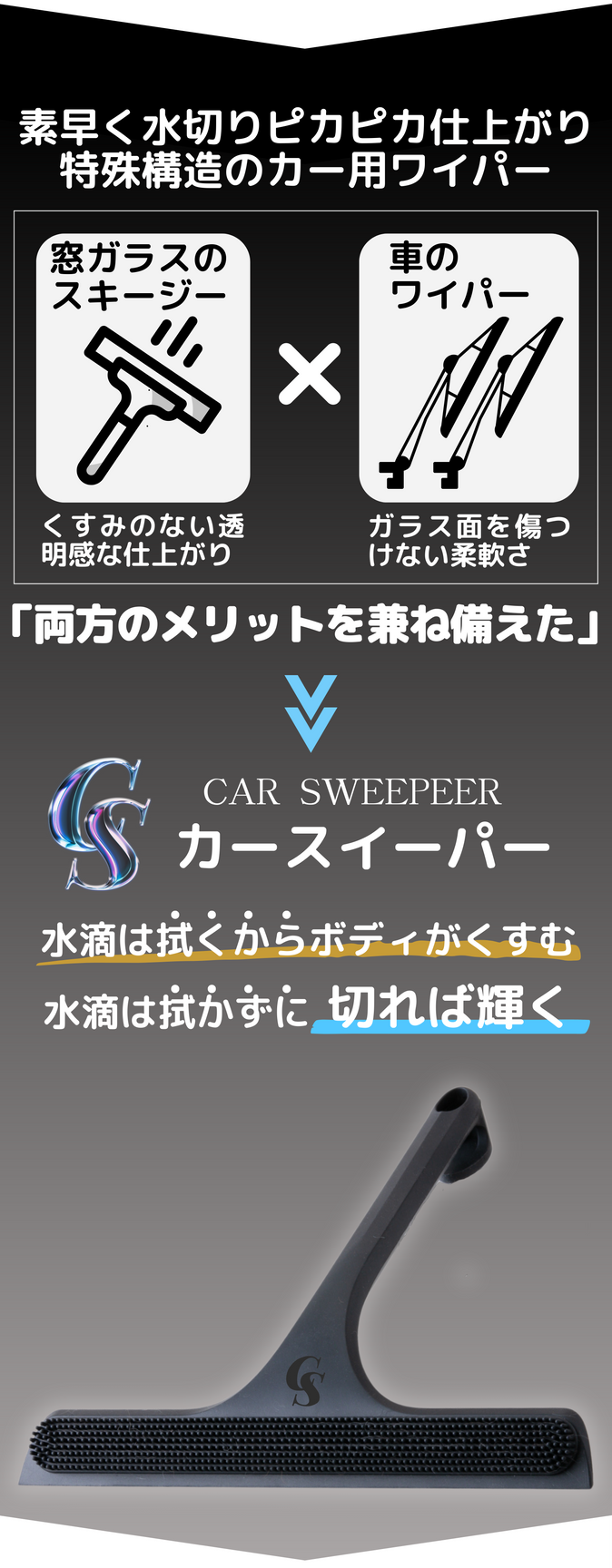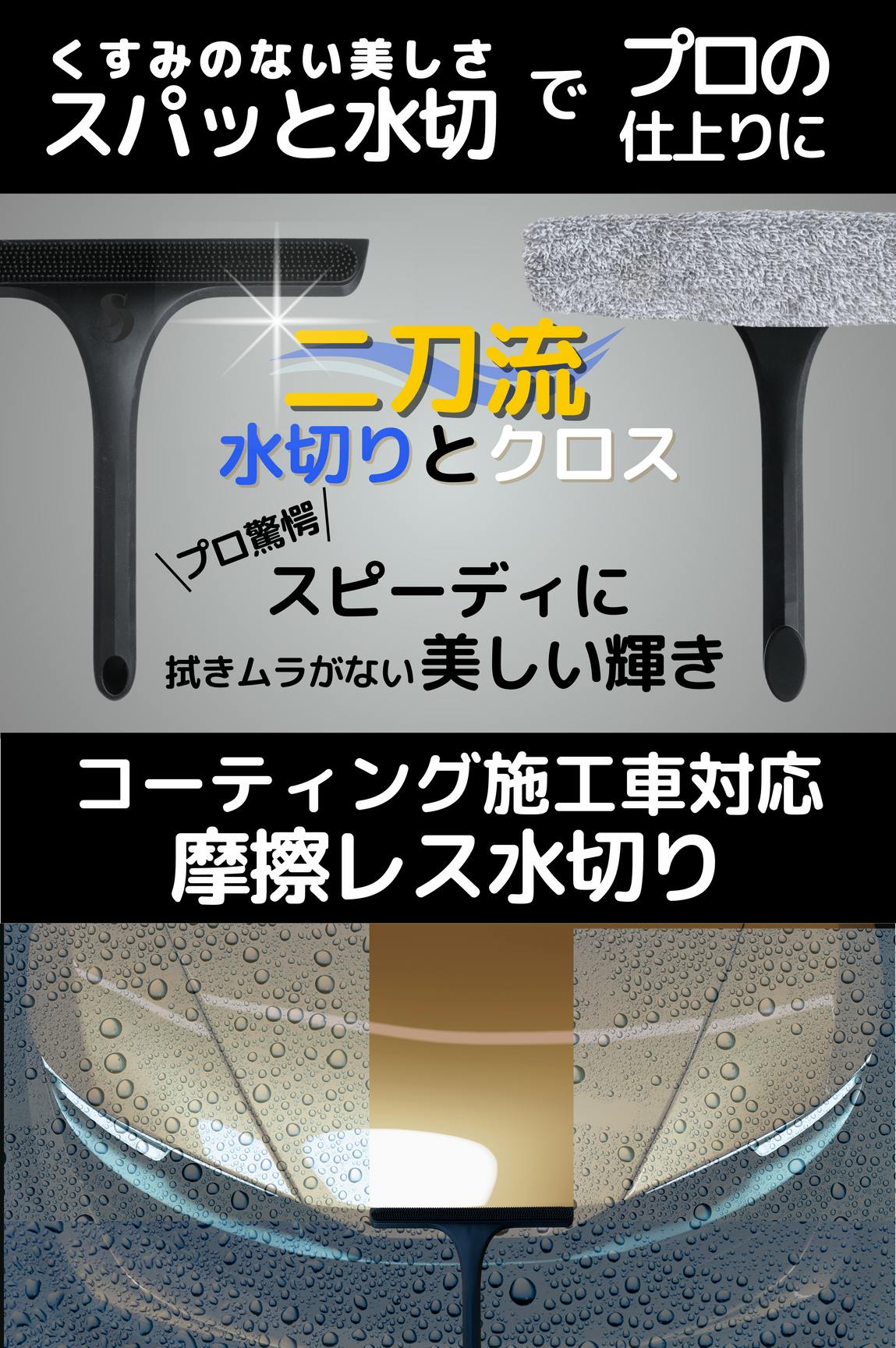 A4:利き手にカースイーパーを持ち、もう片方の手にクロスを持ちます。まずはカースイーパーで水を切っていき、ボディの隙間、段差によって取りきれない水滴を、すばやくクロスでさっと吸わせていきます。「水滴を切りながらクロスで吸わせる」このコンビネーションが一番手早く、しかもボディを美しく拭き上げるコツです。