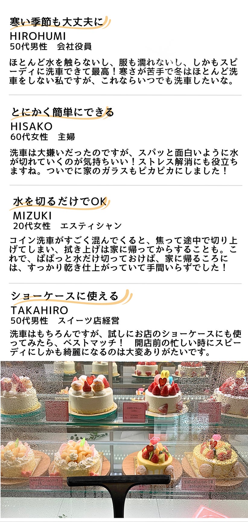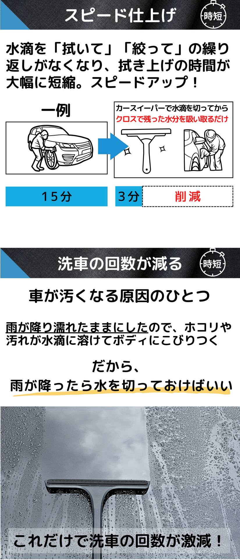 洗車したばかりで気分良く車で外出したのに、、、雨。私は帰宅したら、すぐにカースイーパー(本製品)で、1〜2分足らずでパパッと水を切っておきます。これだけで車が汚れにくくなり、洗車の回数が格段に減りました。また、クロスで塗装面を擦らないので、静電気が発生しにくくなり、ホコリやチリを寄せ付けません。