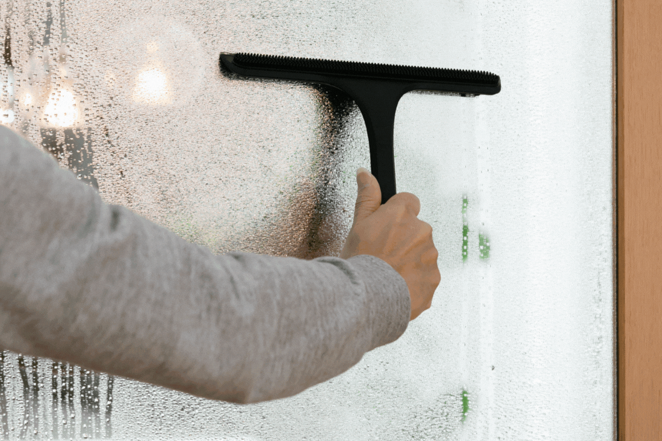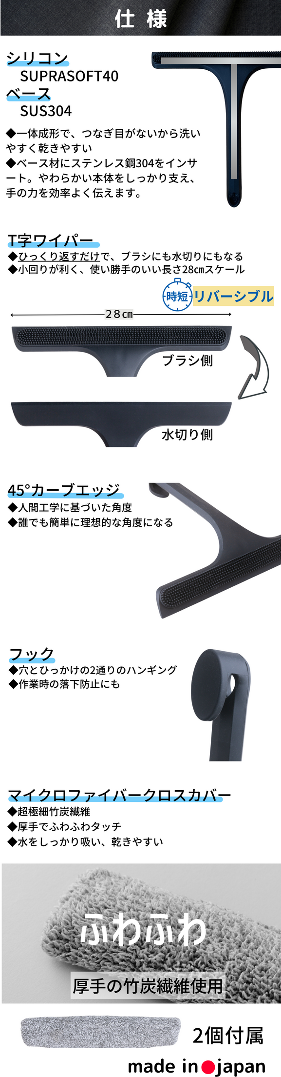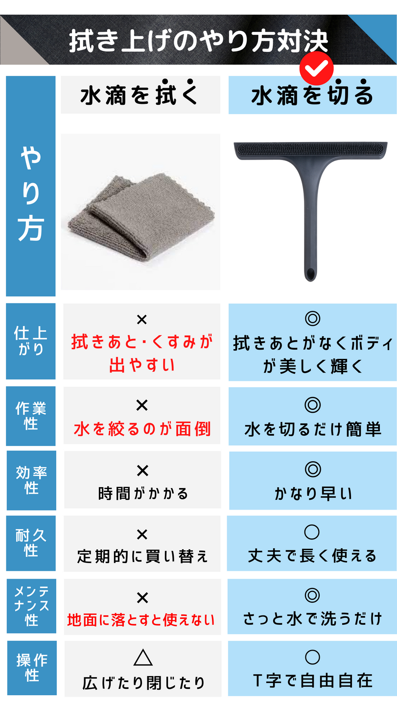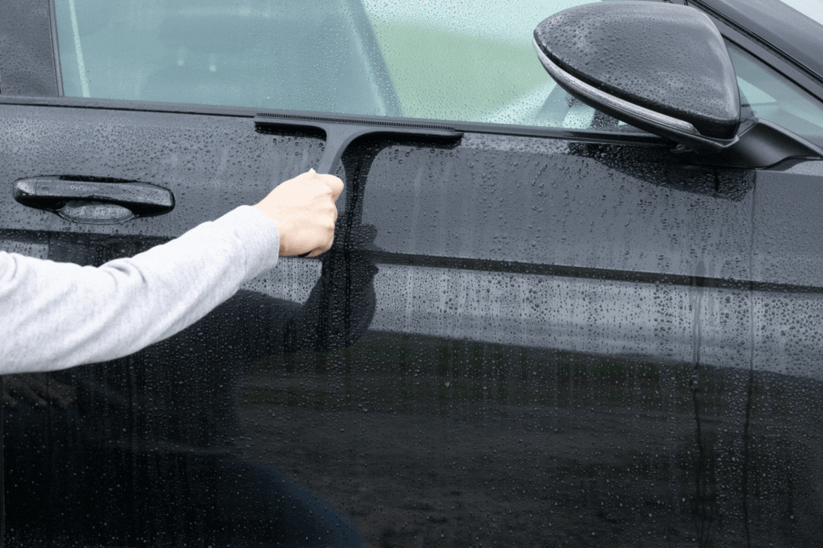 水が重力によって自然に流れるように、上から下に向かって、ワイパーを軽く滑らせて水を切ります。