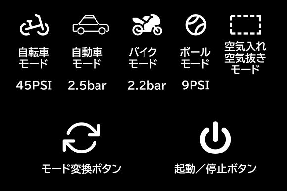 4種類の空気入れモードが予め設定され、初心者でも使用可能です。