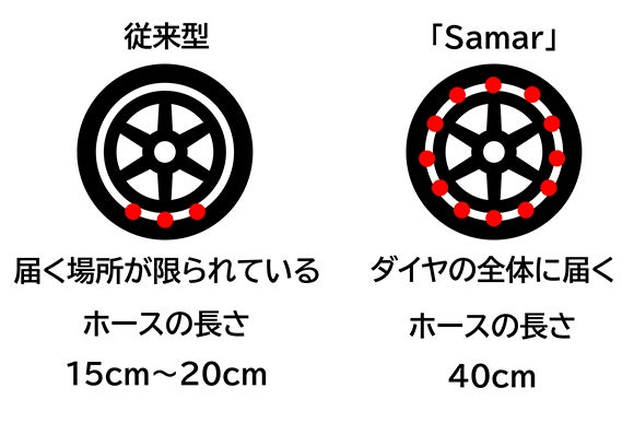 通常のホースの2倍以上の長さ(40cm)で、使用時はタイヤの位置をわざわざ調整する必要がありません。