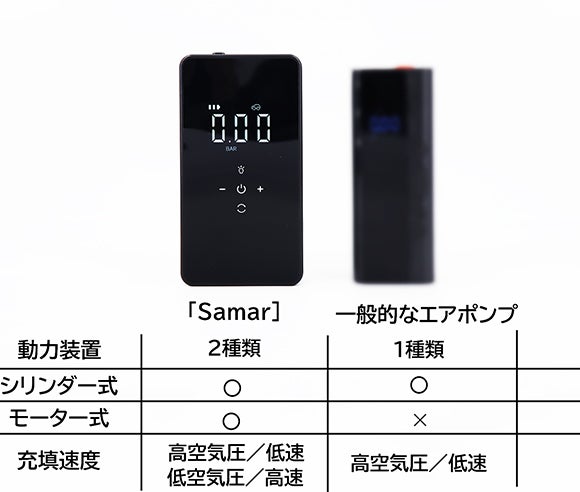 「Samar」はシリンダー式以外に、高速のモーター式も同時に備えているため、風船やエアーベッドなど低空気圧の充填に対して、素早く空気を入れることができます。
