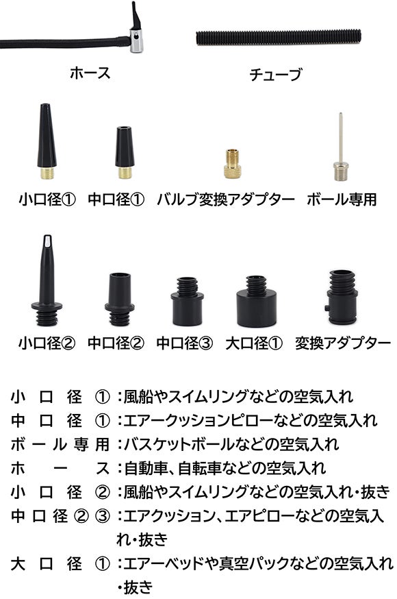 モーター式の吸気口と排気口は本体の頂部にあり、3種類のノズルと組み合わせて、真空バッグや、エアーベッドなどの空気抜きに使用可能。