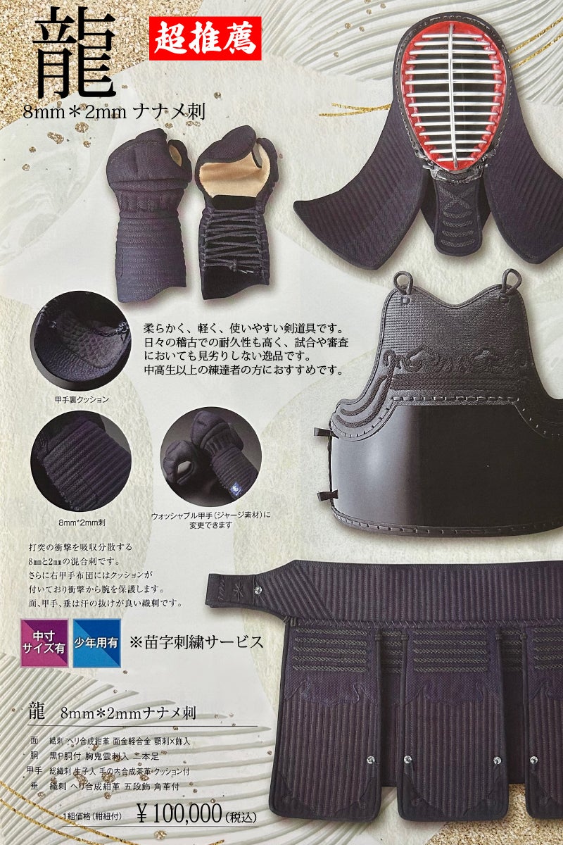 こちらの商品、私自身も手にとって拝見しましたが、軽量なのに打突部位は厚めに作られているため、機能性が非常に高い剣道具です。また、刺し幅が特殊なので、見た目のインパクトが高く、一般剣道家の使用頻度であれば、稽古、試合、審査会全てに対応する仕様となっております。私も過去に垂のみを購入しましたが、早く残りの剣道具を揃えたいところです。