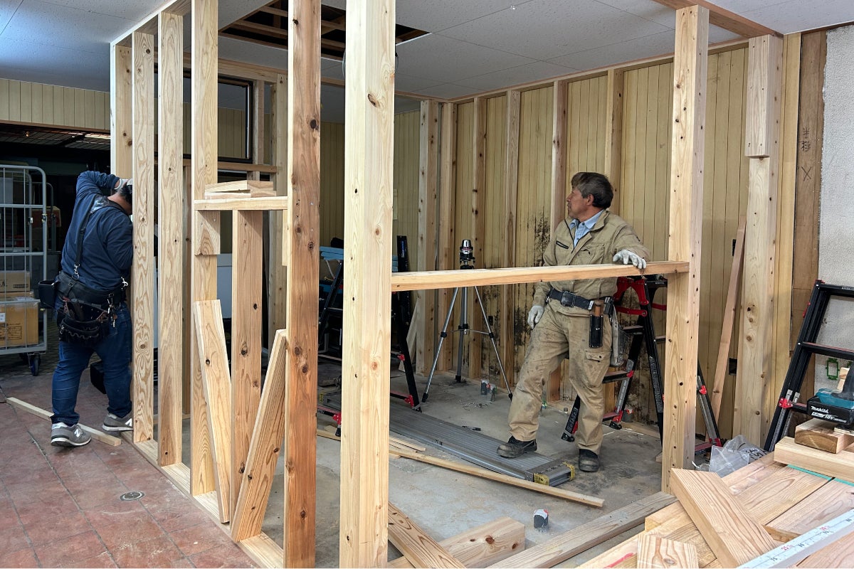 準備万端で待機していた大工さんも、遅れている工期をどれだけでも縮められるよう、猛スピードで取り掛かっています。1日でほぼ枠組みが完成。早いっ!