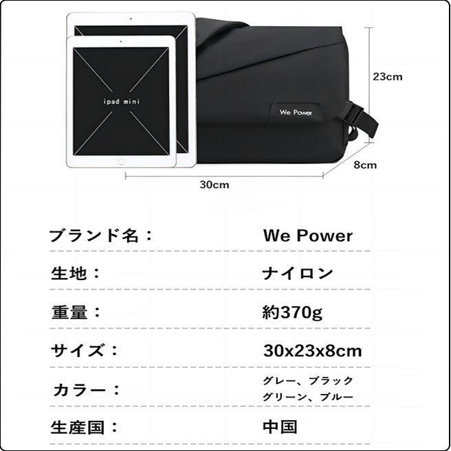 We Powerの表面はナイロンの生地でつくられますので、触り心地がとてもしなやかに加えて、撥水性・耐摩耗性に優れています。あなたの大切なものを持ち運ぶとき、水濡れや衝撃から守ります。