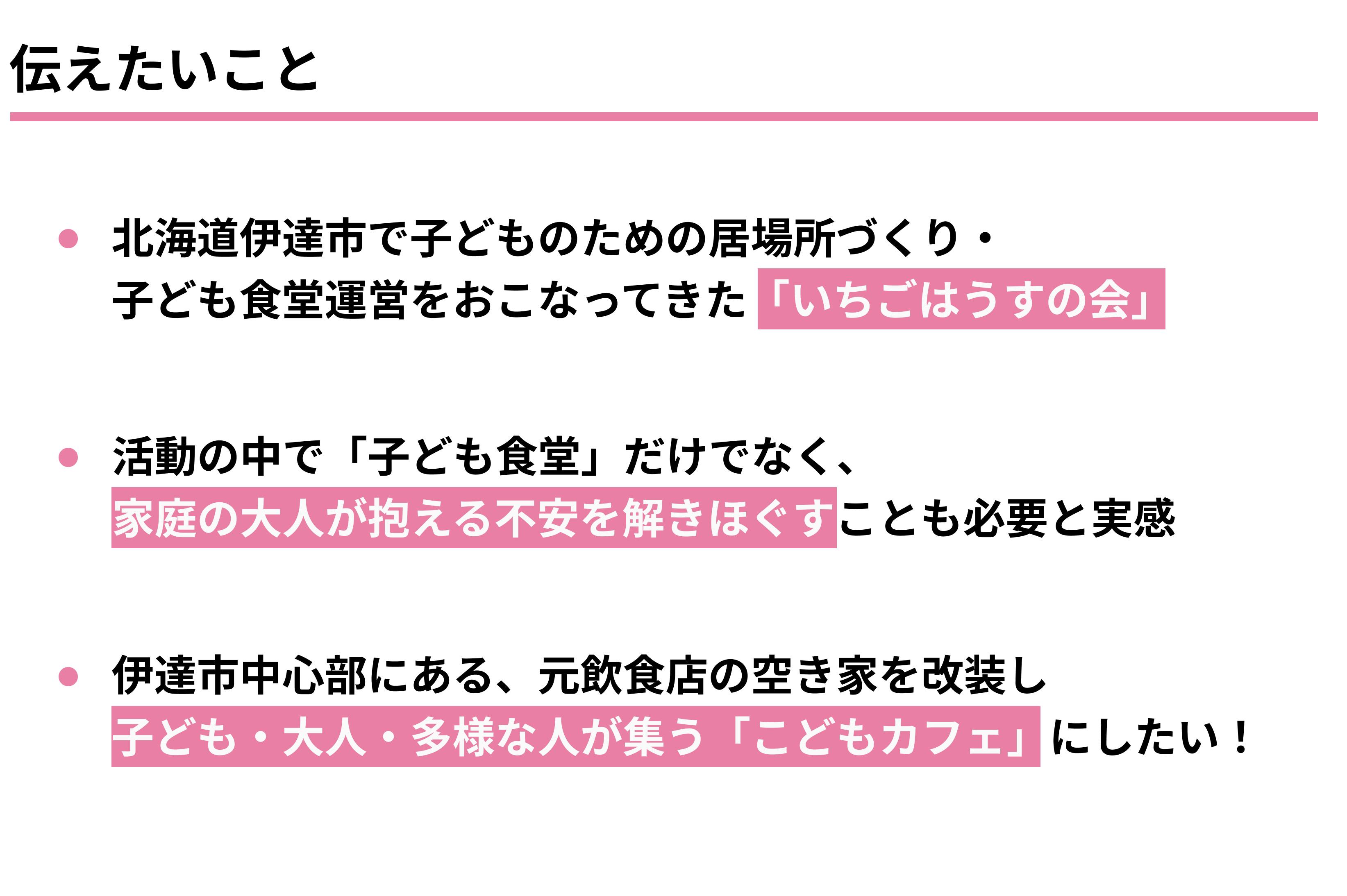 これまでやってきた子ども食堂の活動をもっとオープンにし、関わりしろを増やすことで、「子ども・子育て」のさまざまな困難に寄り添いたい。