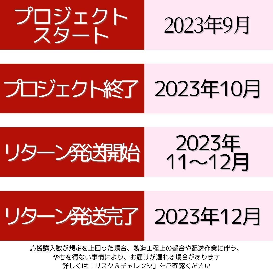 ◆ご支援の数が想定を上回った場合、製造工程上の都合等により出荷時期が遅れる場合がございます。その場合工場と密に連携し詳細が分かり次第活動レポートにてすぐに報告致します。