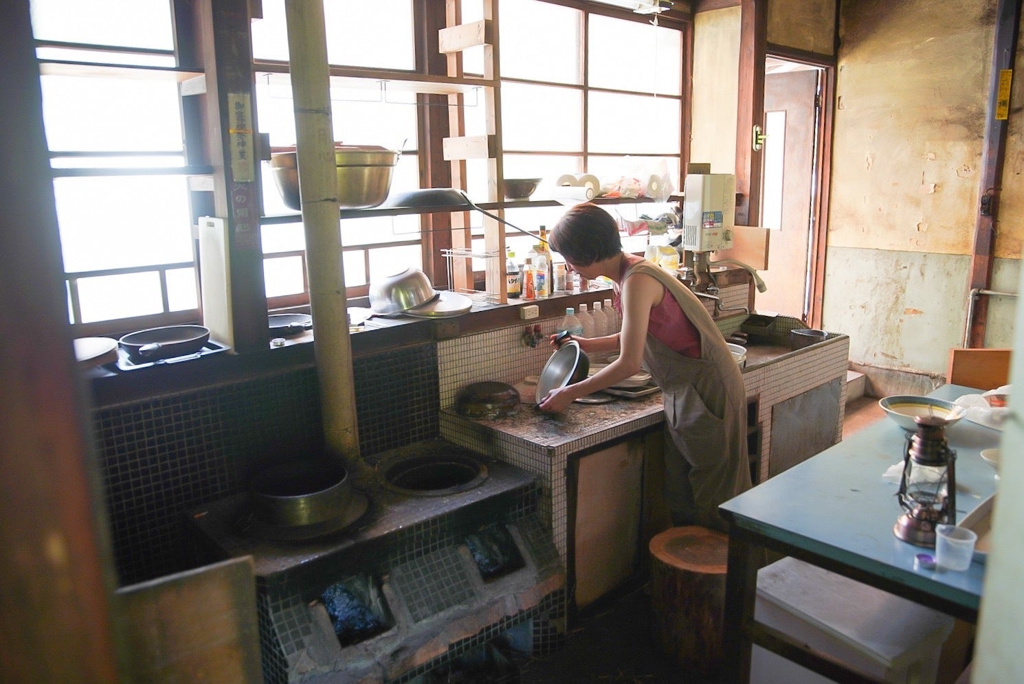 「寺子屋じゃあさ」の台所。でも実は、不便な中でこそ、楽しみながら学べることがたくさんあります。釜戸で昼食を作ったり、近場の山や川で遊んだり。大人も子どもも一緒に遊び、学んでいます(電気が必要な活動は、近隣の「じゃあさ事務所」で行っています。)。
