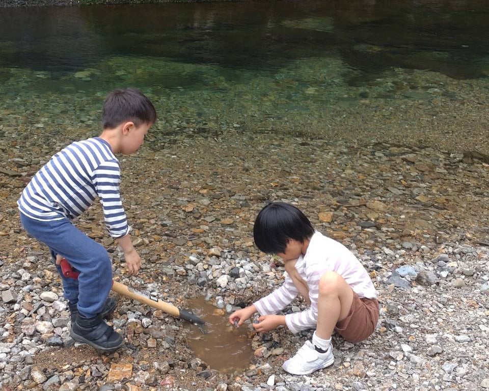 川では、石を並べて水を堰き止める創作をしたり、おもちゃを流したりして遊びます。