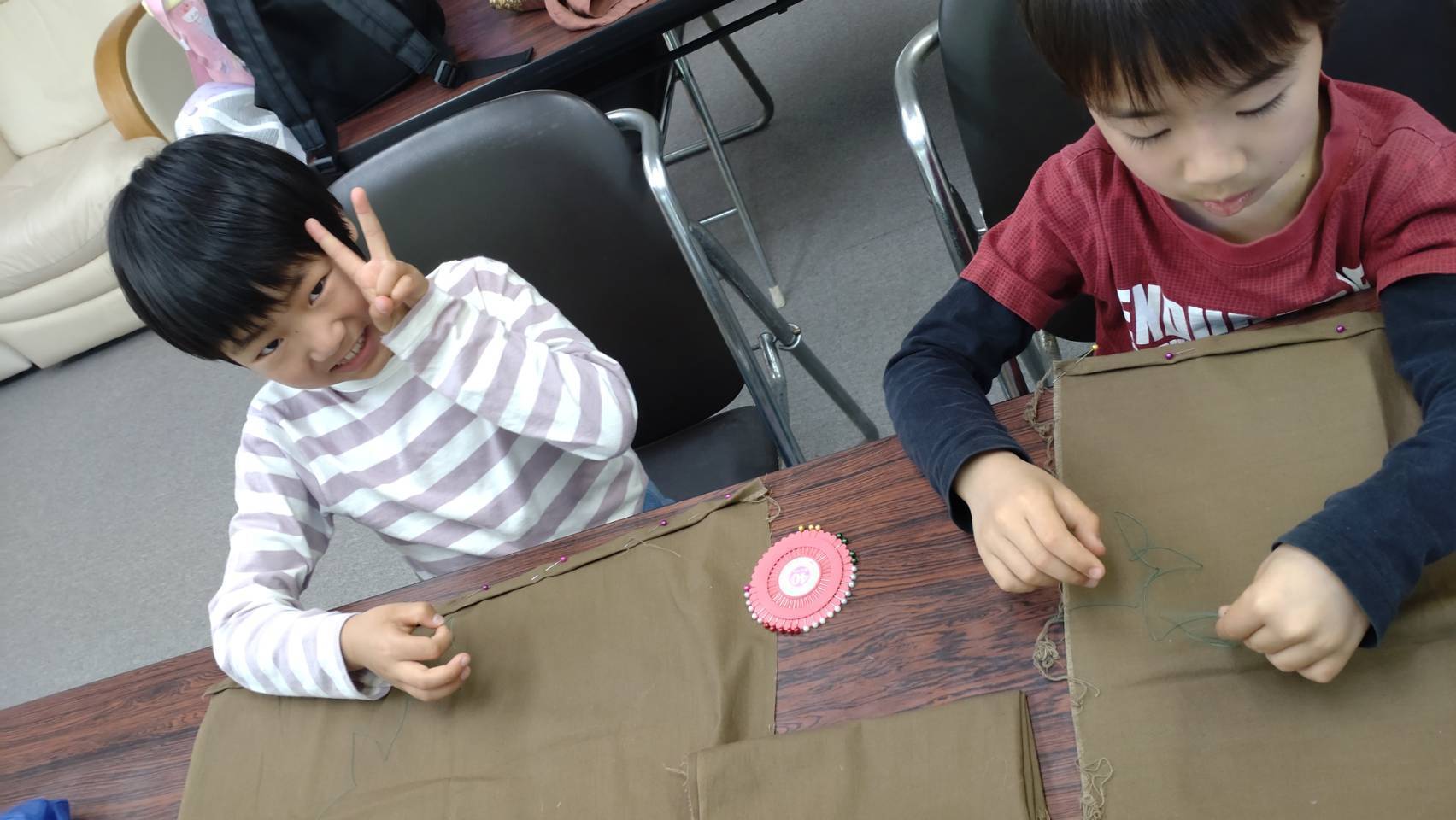 縫い物にも挑戦!寺子屋のように、みんなで自由にのびのび学び合う場所を目指し、大人も子どもも全力で遊び、成長していきたいと考えています。