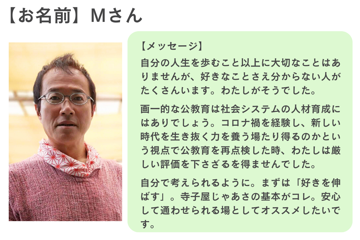 現在通われているお子さんの保護者は、公教育に疑問を持ち、現在の小学校の枠組みの中で我が子を育てることに、強い違和感を抱いている方々でした。
