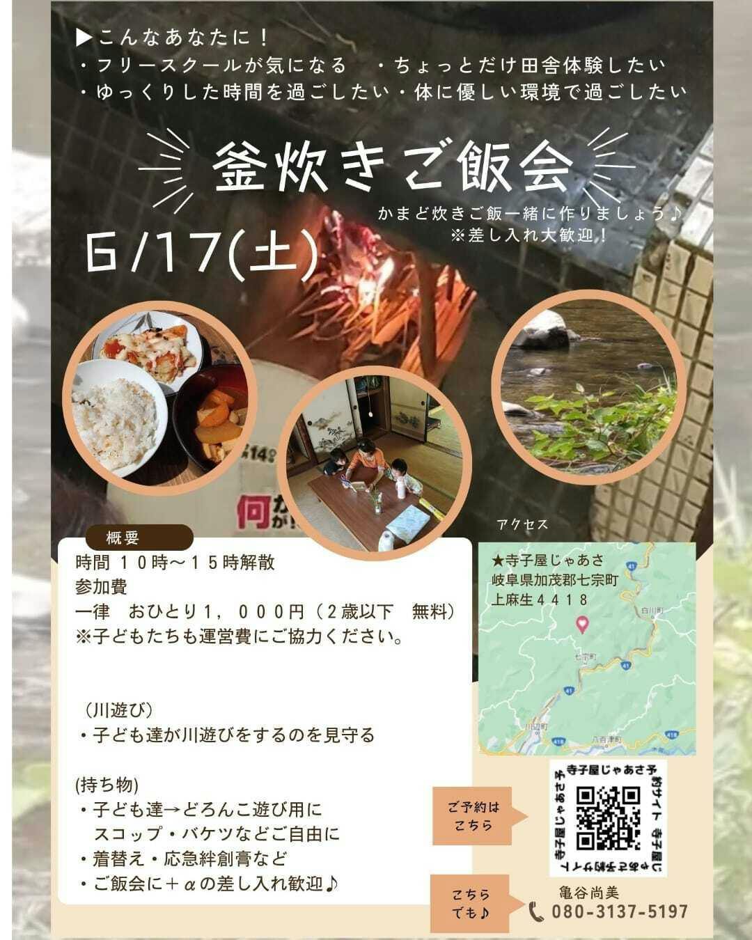 寺子屋「じゃあさ」の活動拠点である古民家には、今時めずらしく釜戸があります。そこでご飯を炊く体験をし、ゆったりとした時間を楽しみながら、子育てや日常生活で感じていることなどを語り合う会です。