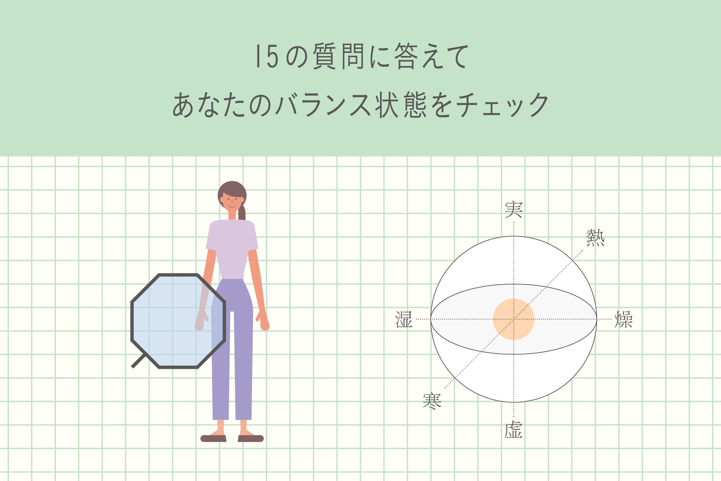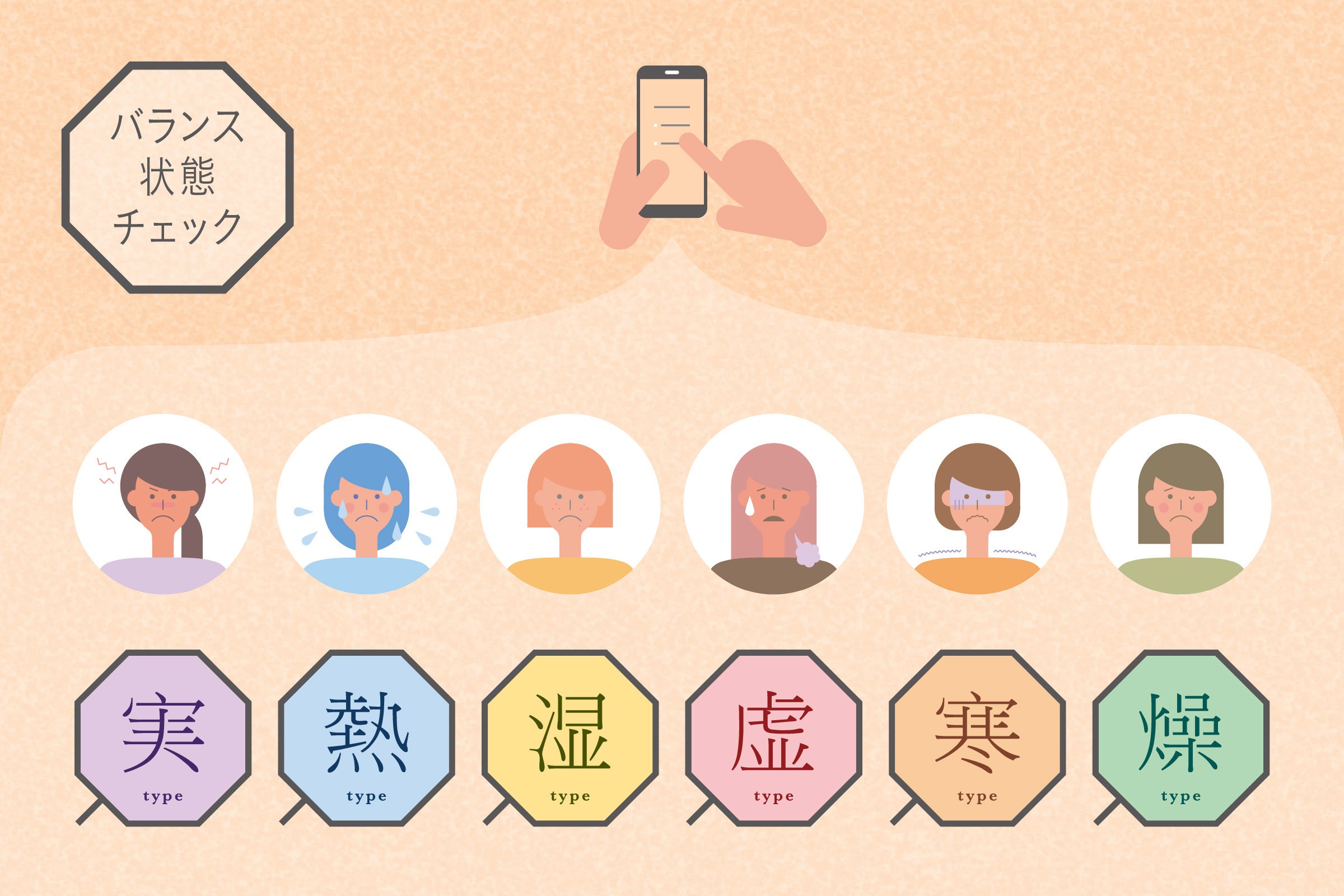 <虚‐実、寒‐熱、湿‐燥>という3軸・6要素の組み合わせから、8つのタイプに分類し、あなたのバランス状態をチェックします。