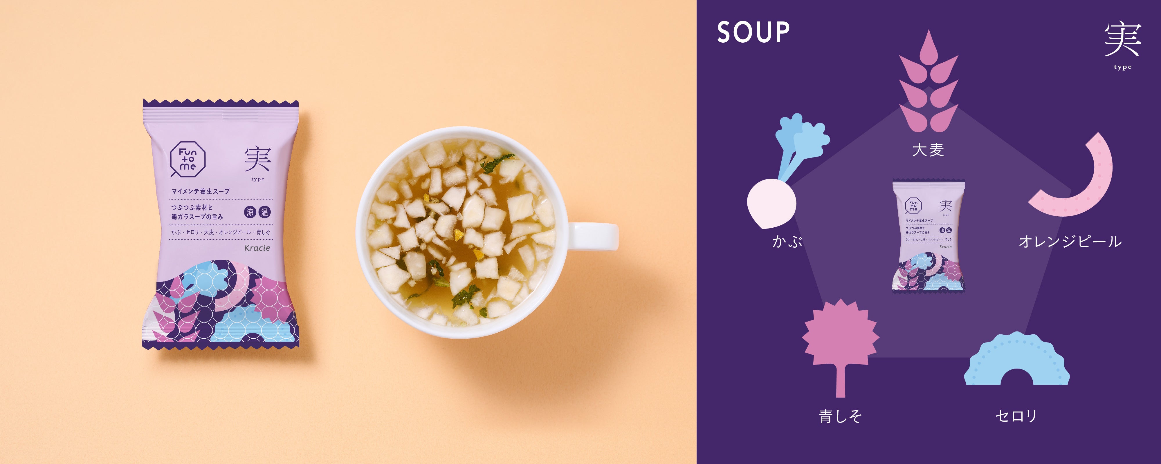 穏やかにあたためる温性と、緩やかに冷やす涼性の和漢素材を組合せ、かぶ・セロリ・大麦・オレンジピール・青しそを使用。