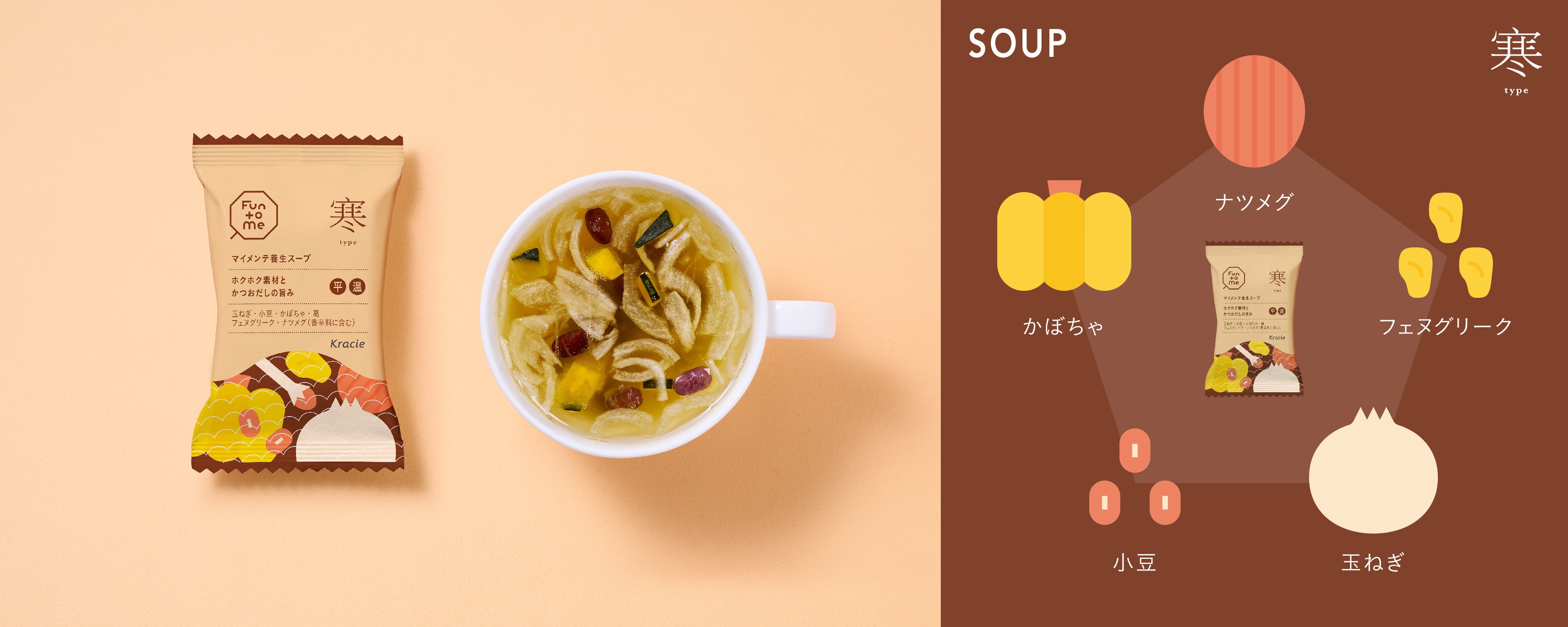 ホクホク食感の和漢素材とかつおだしの旨味が特長のフリーズドライスープです。