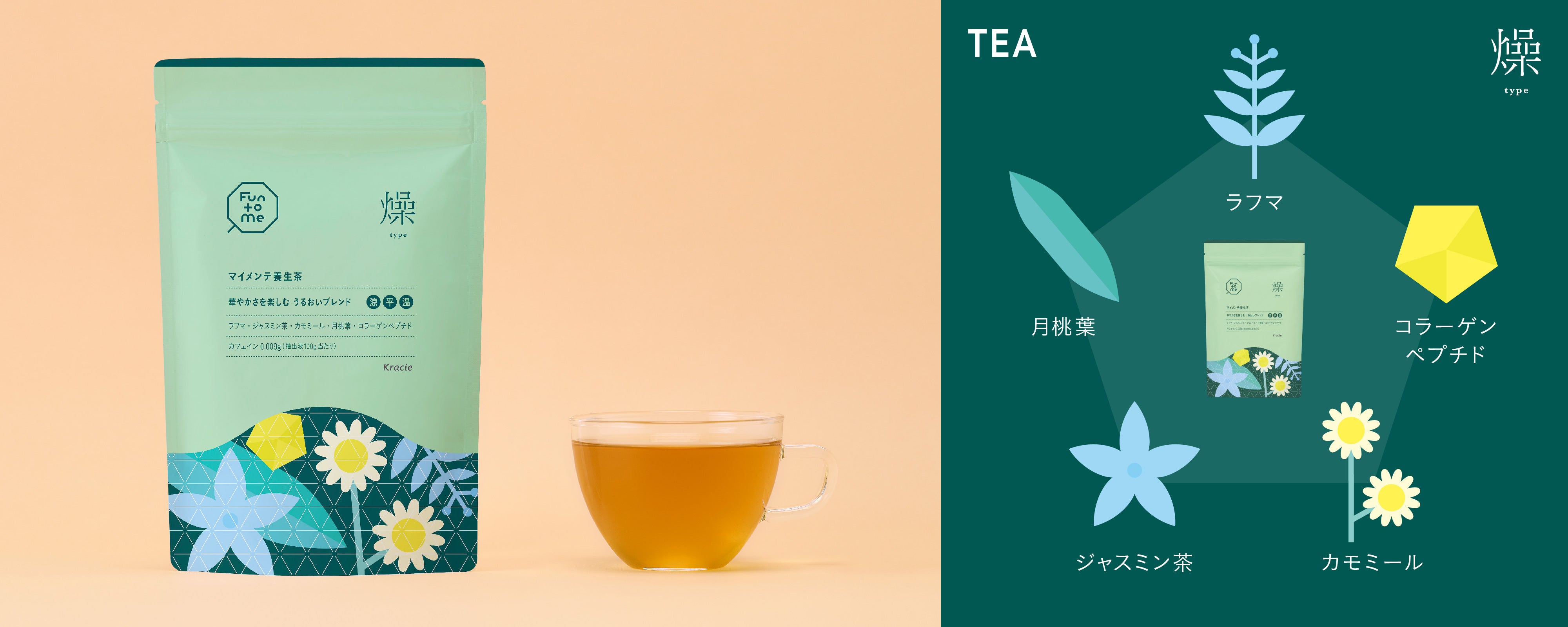 穏やかに冷やす涼性、穏やかにあたためる温性、フラットな平性の和漢素材を組合せ、ラフマ・ジャスミン茶・カモミール・月桃葉・コラーゲンペプチドを使用。