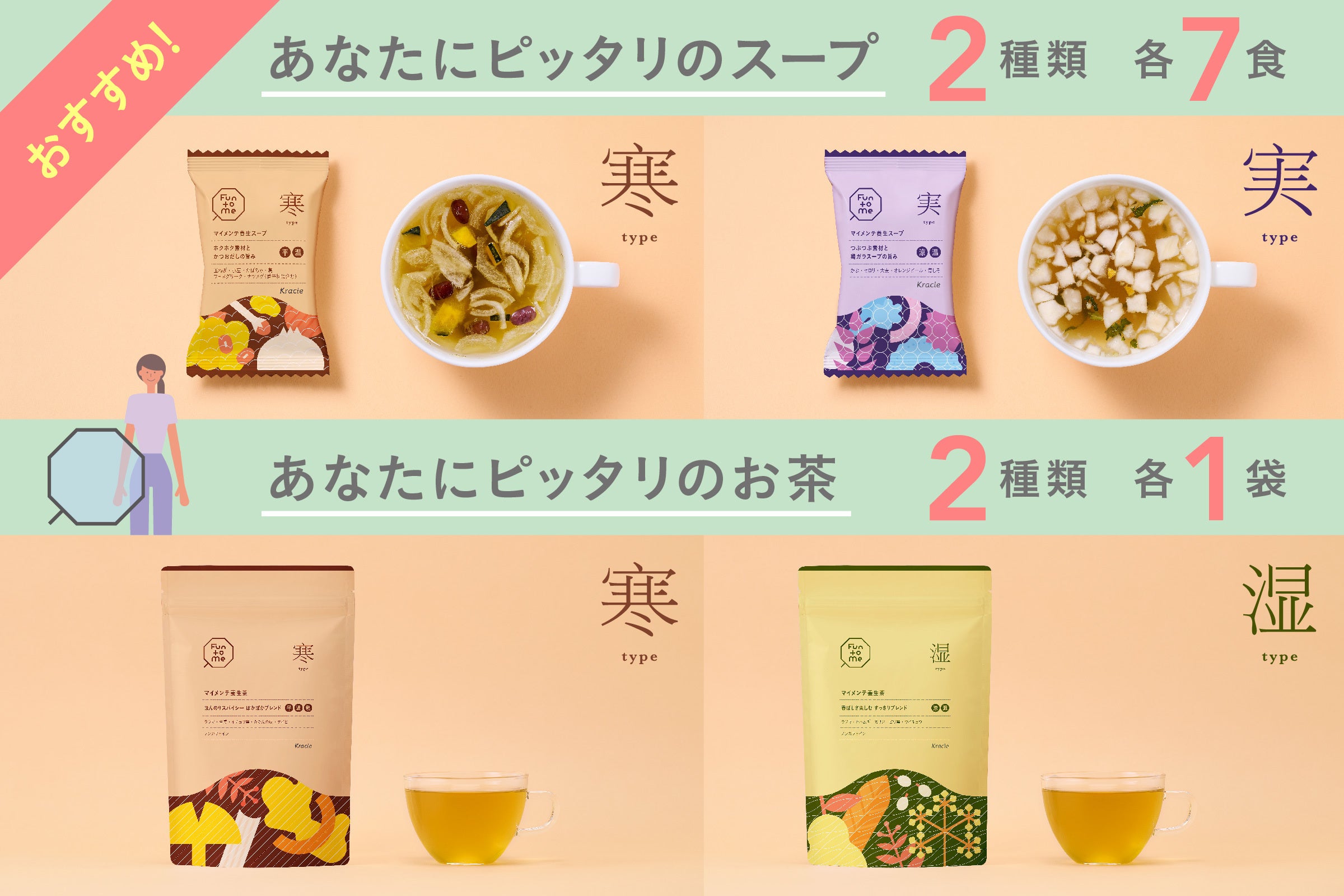 なんだか調子がよくないーそんな時に手間暇をかけた料理をつくるのは大変ですよね。「Fun to Me」ではお湯を注ぐだけで手軽に飲める【おいしい養生スープと養生茶】のセットをご用意。時間の余裕がなくても、特別な知識がなくても大丈夫。バランスタイプに合わせた和漢素材をブレンドしたこだわりの養生食を簡単に取り入れていただけます。時間がない朝や手軽に済ませがちなランチにスープをプラスしたり、ほっと一息つきたい時にお茶を飲んでリフレッシュするのもおすすめですよ。