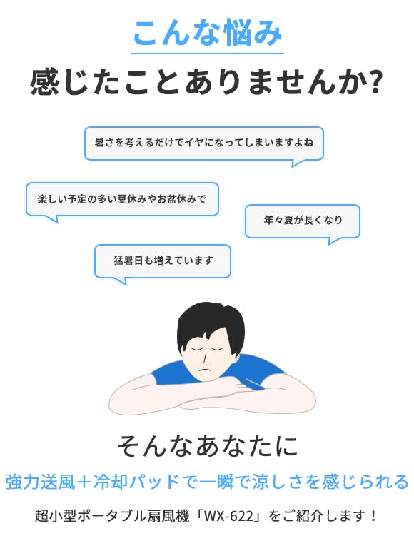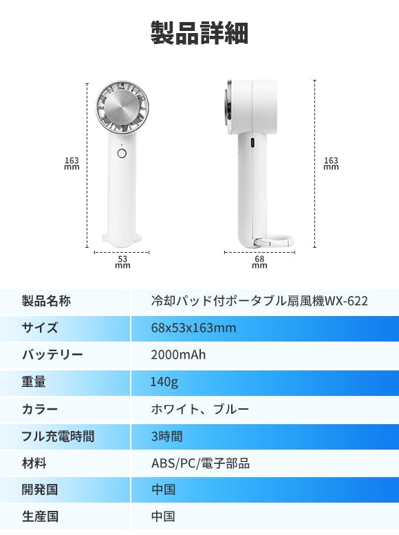 WX-622は140gと超軽量!6枚のファンによる強力送風で、風速は3段階で調節できます。冷却パッド付きですので、顔や首などに直接当ててすばやく冷やすことが可能です。今年の夏はこの1台で快適に過ごしましょう!