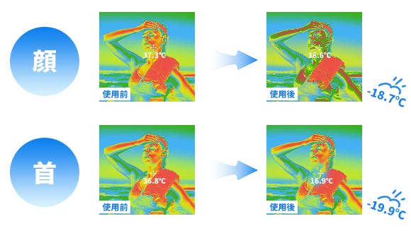 以下はWX-622の使用前後を撮影したサーモグラフィー画像です。冷却パッドを顔と首に1分間当てた後、20℃近く温度が下がっていることが分かります。