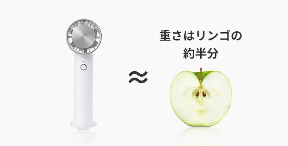 本体の高さは163mm、ファンヘッドの直径は68mm、重量は140gでリンゴ半分とほぼ同じ軽さです。持ち運びやすく、いつでもどこでも活躍します。