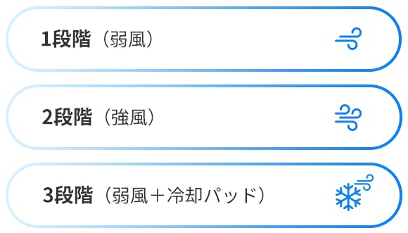 6つの強力タービンとブラシレスモーターでパワフル送風を実現しました。風力は弱、中、強の3段階に調節できます。お好みに合わせてお選びください。