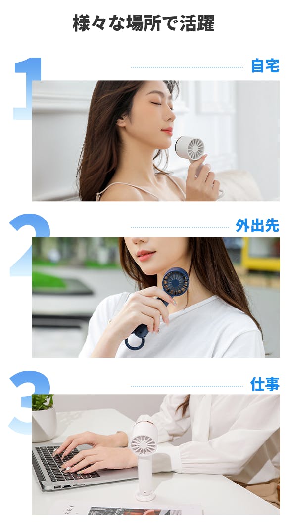 2000mAhの大容量バッテリー搭載で、フル充電1回で最長5時間連続使用可能です。1日中涼しい風を持ち歩きましょう。