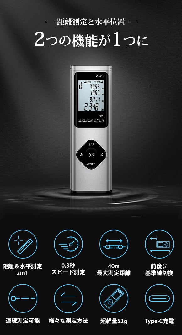 レーザー測定器「z-40」は、距離と水平位置を測ることができる2in1のポータブルなデバイスです。