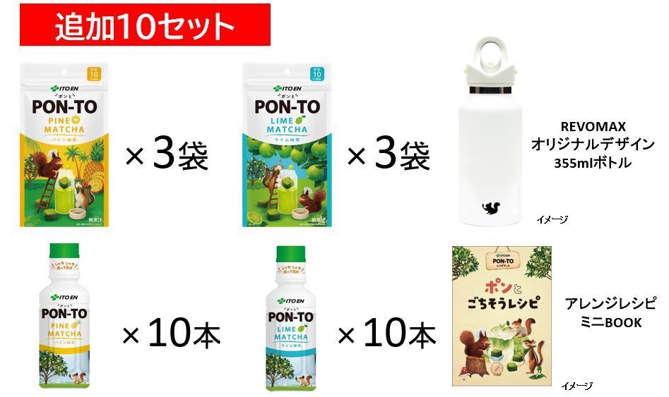 皆様こんばんは追加リターンのお知らせです!このたび、「炭酸も持ち運べるREVOMAXオリジナルデザインボトルが入ったパーティーセット」リターンにおいて、私たちの予想を上回るご購入希望を頂きました!ありがとうございます。そこで急遽、ご好評につき10セット追加させて頂きました。このプロジェクトを今知って頂いた方や、ご購入を迷われていた方は、ぜひこの機会にご検討ください。また、もう一つお知らせです。オリジナルデザインが入ったREVOMAXボトルの試作品が出来ました。REVOMAXオリジナルデザインボトル試作品このように、ポンと3きょうだいの三男「ポンとんと」の可愛いシルエットがあしらわれています。いよいよお届け分の生産ヘと進めていきますので、ご購入頂いたみなさま、お届けまでぜひ楽しみにお待ちください。ここで、簡単!炭酸割りの楽しみ方をご紹介します。①最初に少量お水をいれる(1粒あたり20~30ml)。②キューブをポンといれる。③蓋をしっかり閉めて、キューブが溶けるまで振る。④蓋を開けて、ゆっくり炭酸水を注いで完成。お好みの濃さに合わせて、キューブの数を調節してアレンジしてみてください。※パウダーインキャップタイプの炭酸割りもオススメです♪REVOMAXボトルは炭酸が長持ちし、真空断熱ボトルのため長時間ひんやり冷たいまま楽しめます。今回、ライム抹茶の炭酸割りをつくってみました。ライムの香りと炭酸のシュワシュワがとっても爽やかで、抹茶も程よく感じられる味わいです。ライム抹茶に限らず、パイン抹茶もお試しください。この他にも、インスタグラムには、インフルエンサーの皆様が実際にPON-TOを作ったり、飲んだりしてくださっている素敵な投稿を「PON-TO体験レポート」としてまとめています。ぜひPON-TOアカウントを覗きに来てください。■PON-TO/ポンと【公式】 Instagramアカウント(@ponto_itoen)https://instagram.com/ponto_itoen?igshid=NGVhN2U2NjQ0Yg==次回の活動報告もお楽しみに。引き続き、どうぞよろしくお願いいたします。