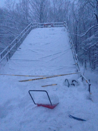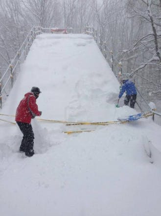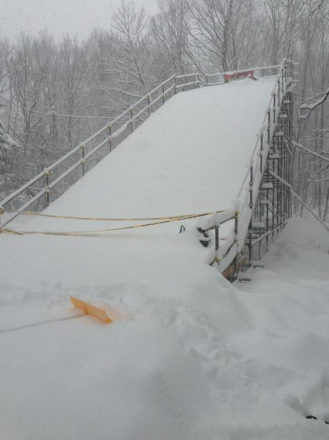 ・・・慌ててスタートヒルの除雪作業開始するも、保護シートの表面が凍ってしまっていて超ツッルツル!!危