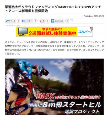 シクロチャンネルに、さらなるチャレンジに向けて、YBPのアマチュアコース利用券を提供開始したことを取り上げて頂きました! 栗瀬裕太がクラウドファンディングCAMPFIREにてYBPのアマチュアコース利用券を提供開始「シクロチャンネル」 http://www.cycloch.net/2013/07/20/11380/