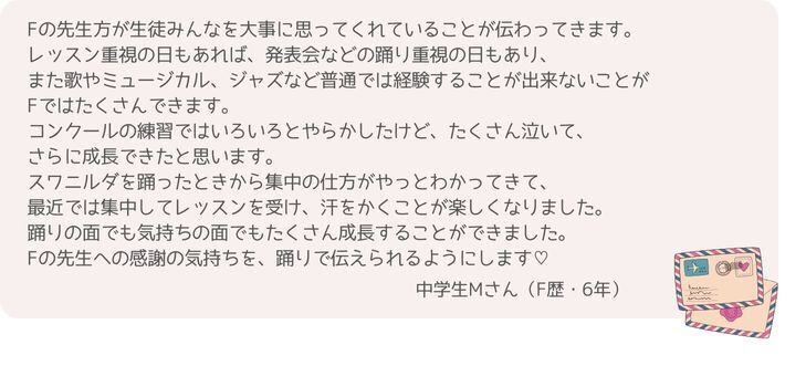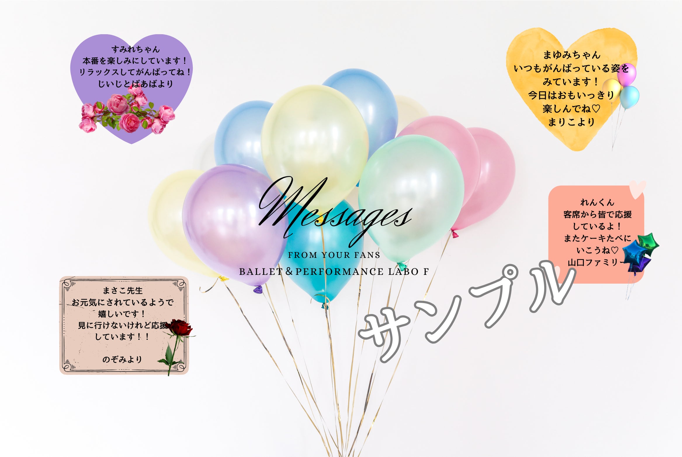 2023/09/05 11:318月にスタートした本プロジェクト、早々に皆様から温かいご支援とメッセージをいただき誠にありがとうございます!リターンの発送は10月8日のプロジェクト終了後から順次開始いたしますので、いましばらくおまちくださいませ。今日は3000円リターンの内容のご紹介をさせていただきます♡一言メッセージのパンフレット差込は上記の画像↑↑↑のようなデザインを予定しています!当日みにきてくださる方は出演者にサプライズメッセージとして!また来られない方も祝電がわりにいかがですか??皆様からのメッセージをかわいくお花やアイテムを添えて編集いたします♪(もう少し体裁ととのえますね!!)引き続きプロジェクトのご支援をよろしくお願いいたします。Fのプロジェクトリンクはこちらhttps://camp-fire.jp/projects/view/688001---------------------レッスンも本番を想定したリハーサルがメインになってきました。みんな、いまここが頑張りどき!!気合いをぐっといれて、役になりきって、1回1回の練習を大切に、みにきてくれる方々支えてくれている方々にすこしでも多くの楽しい気持ちをお届けできるように!!こどもたちによる衣裳の汚し演出にも磨きがかかっております↓いつもありがとうございます♡Ballet&PerformanceLabo F もっと見る