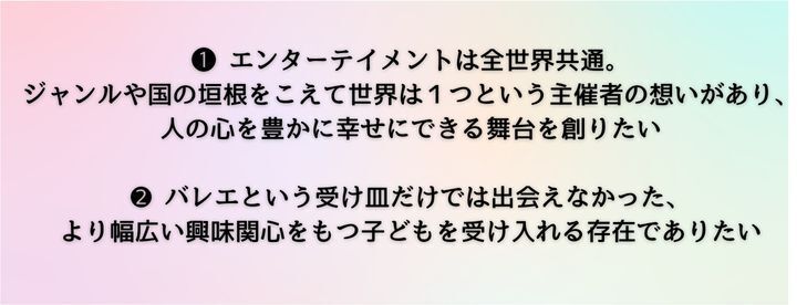私たちがバレエの枠をこえて歌やダンス、ミュージカル要素を取り入れるのには2つ理由があります。