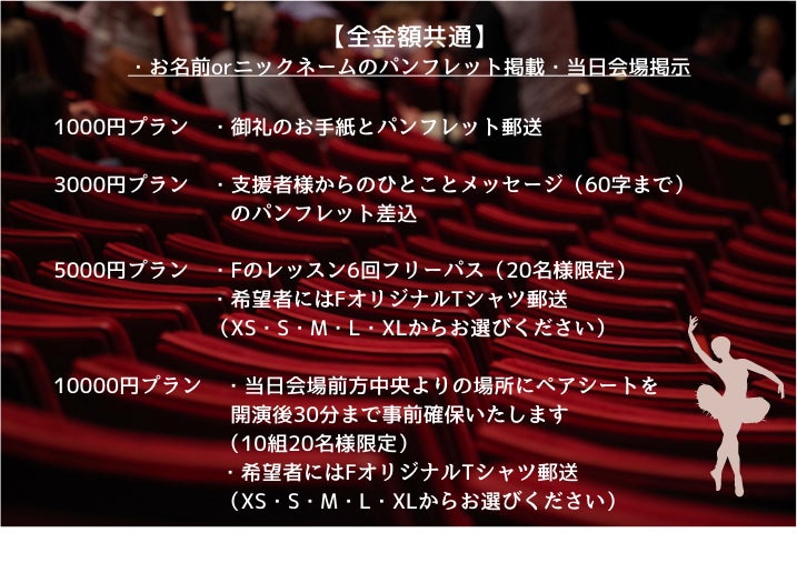 本公演は元々有料チケット制ではなく整理券による自由席の無料公演です。10000円プランご選択の方におかれましてはその点ご承知おきください。また本番の撮影や録画録音はかたくお断りいたします。