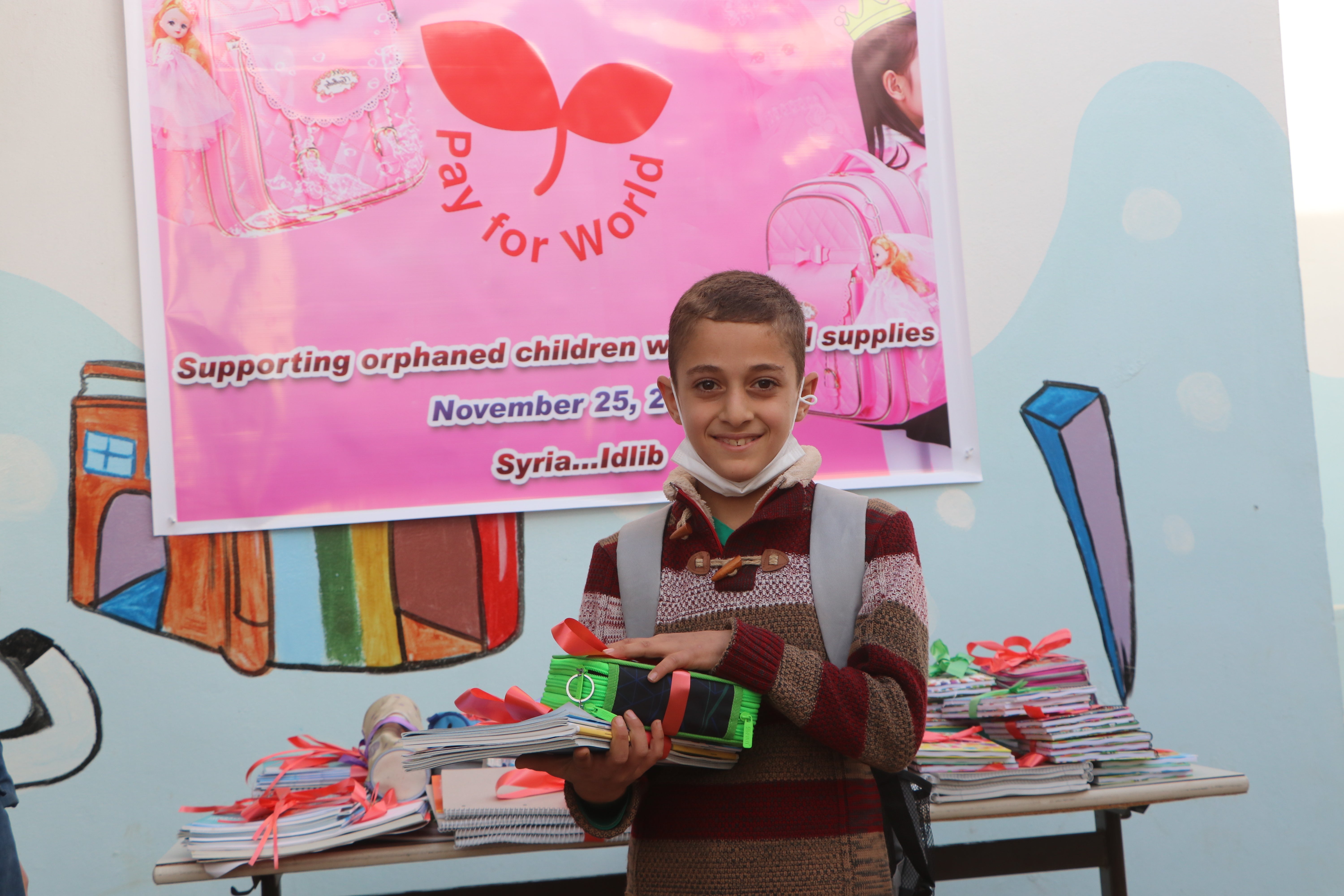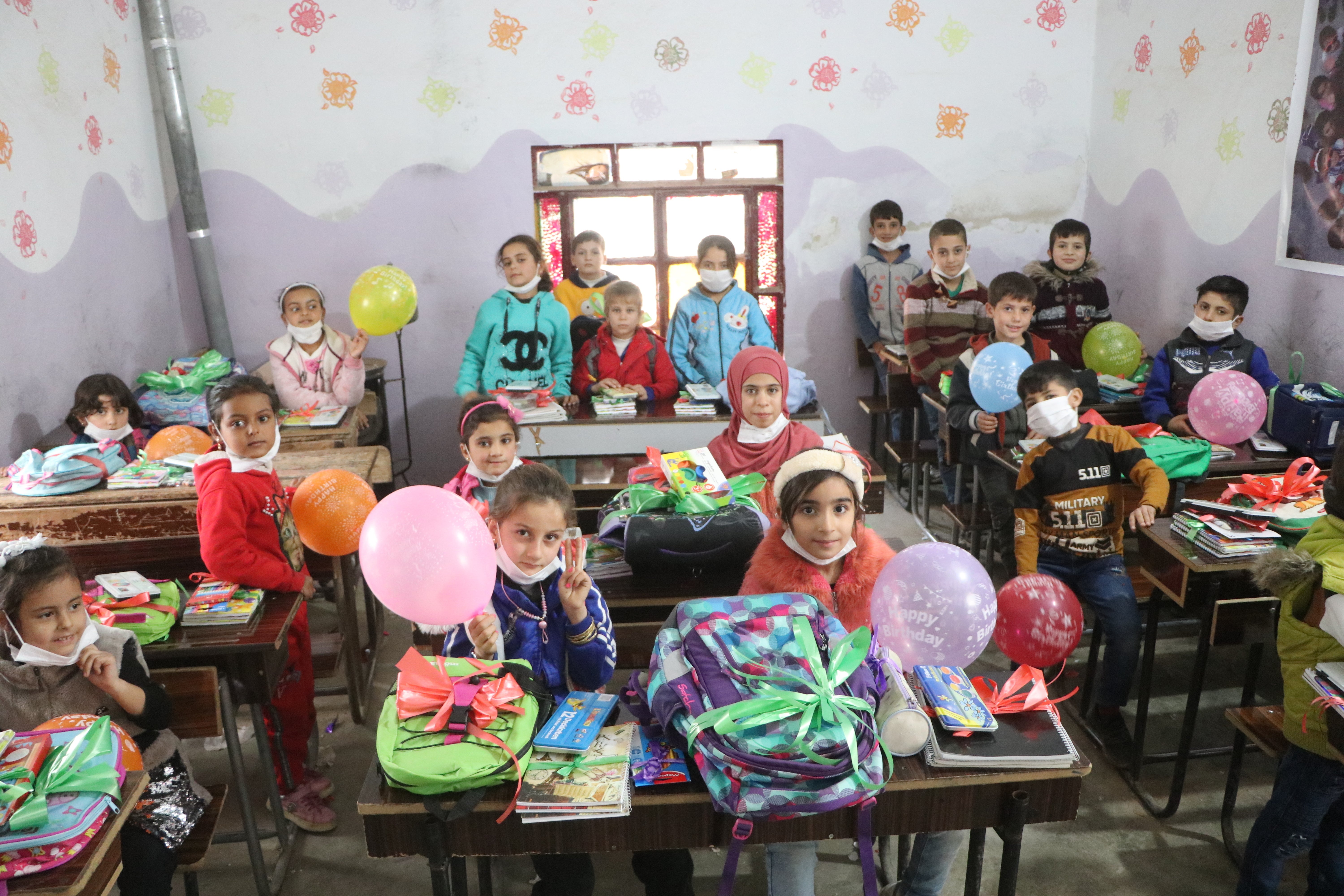 ※この写真は私たちの寄付がシリアの子供たちに文房具や通学かばんとして届いた時の写真です。※内戦下のシリア・イドリブ県にあるヒバアッラーチャリティーセンターという内戦孤児の為の学校です。