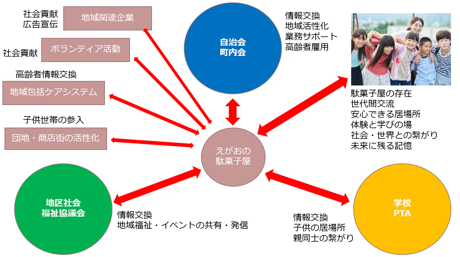 「えがおの駄菓子屋」がある場所の自治会・町内会との連携、高齢者サロンの運営は地区社会福祉協議会、他今後は学校や高蔵寺周辺の会社様とも連携を取っていく予定です。