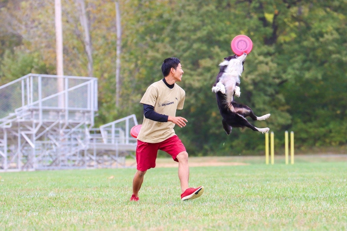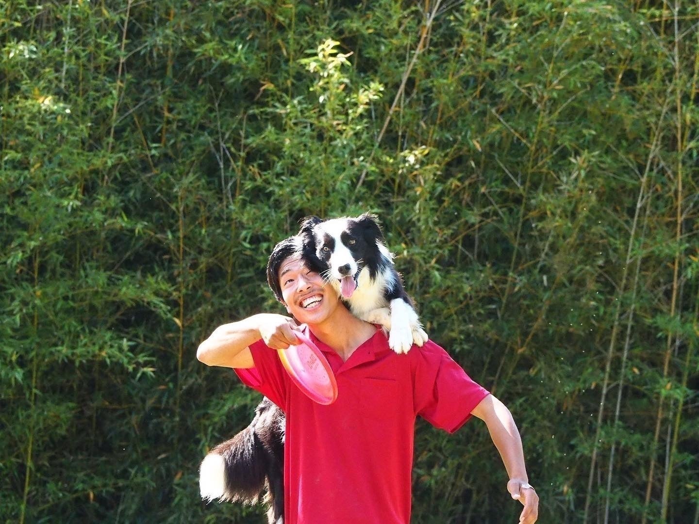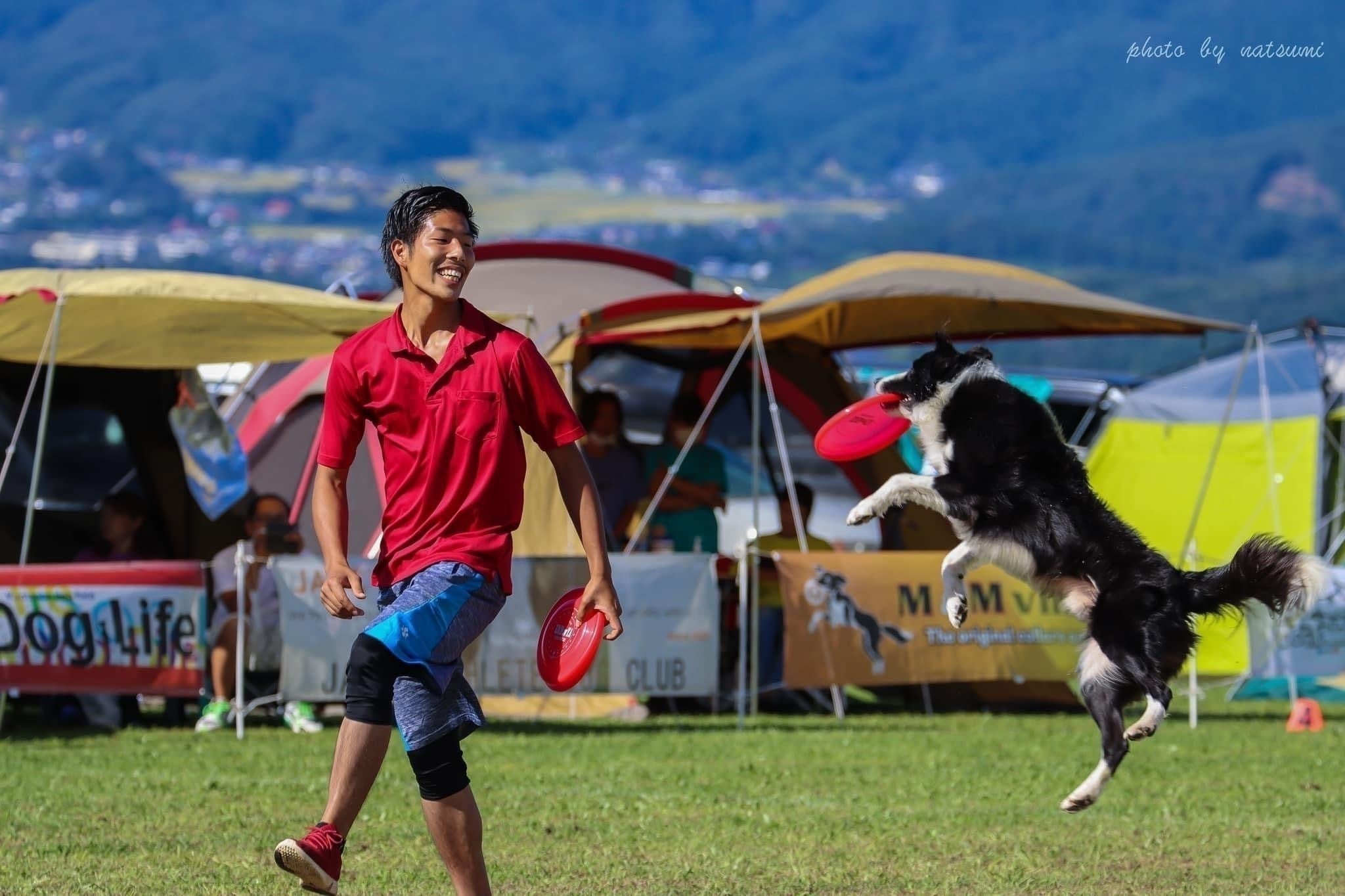ディスクドッグプレイヤーの谷 瑛馬と申します。27歳です。愛犬のレッツと仕事の傍ら、トレーニングを重ねる日々を過ごしています。